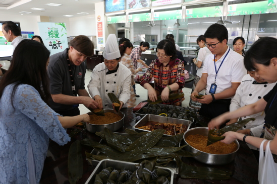 5月27日,由校工会主办、后勤实业发展中心承办的“粽”爱端午——2017年端午佳节活动在我校第二餐厅举办。校工会常务副主席柳如荣代表学校向教职工们致以节日的问候和祝福。后发中心准备了美味粽子和制作粽子的材料,让大家亲身体验了包粽子的乐趣,还准备了精美的空香包和不同功效的香草,供大家制作自己喜欢的端午香囊。活动中,弥漫着节日的气氛,充盈着端午的欢愉,在现场参加活动的老师跃跃欲试,外教老师们也参与进来,通过现场的工作人员手把手教学,一个个模样可爱的粽子出现在老师们的手中。在制作香囊的体验区,教师们根据不同香料的作用,配置出不同功效、不同味道的的香囊。活动现场气氛热烈,教职工们不亦乐乎。