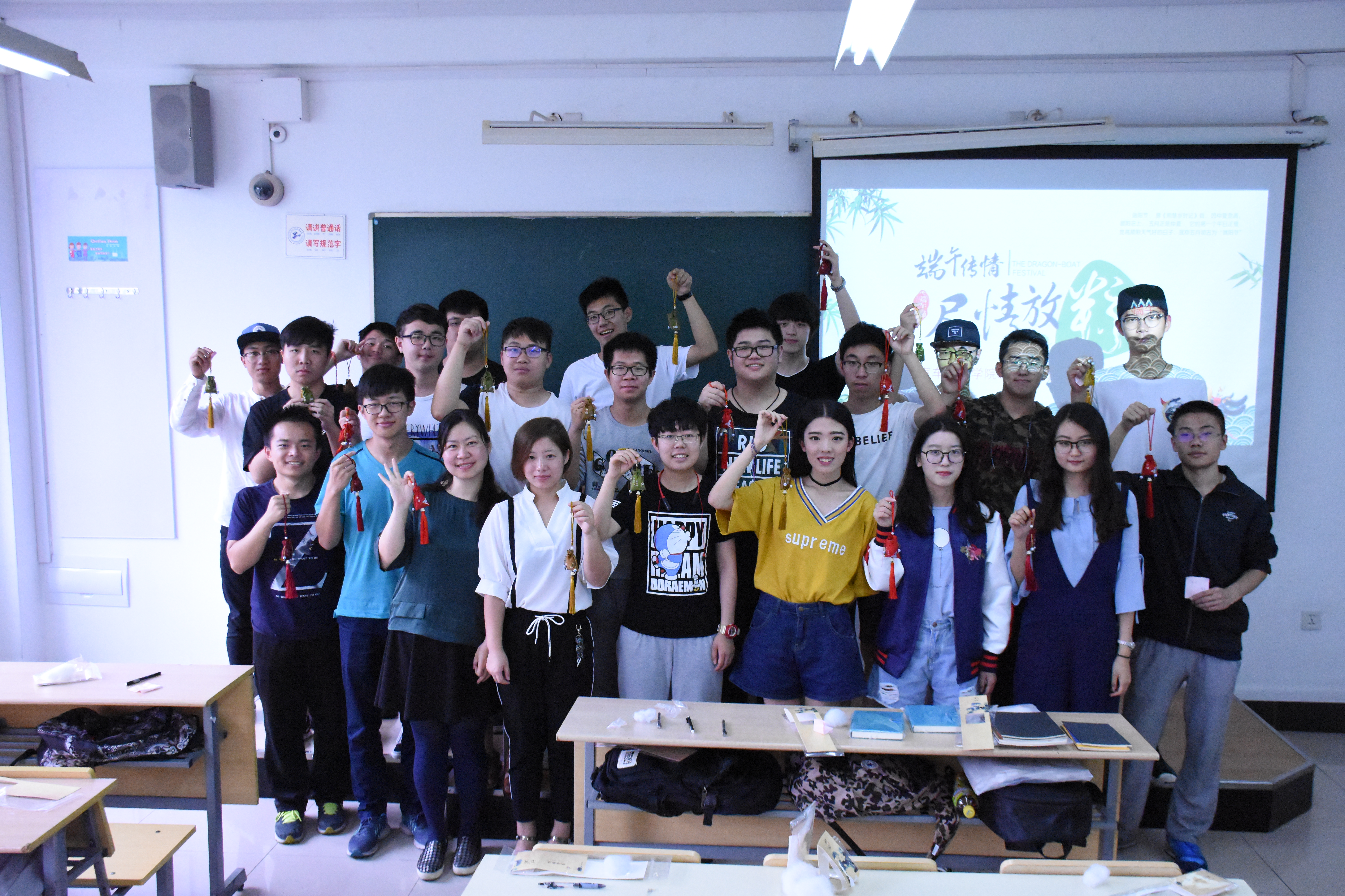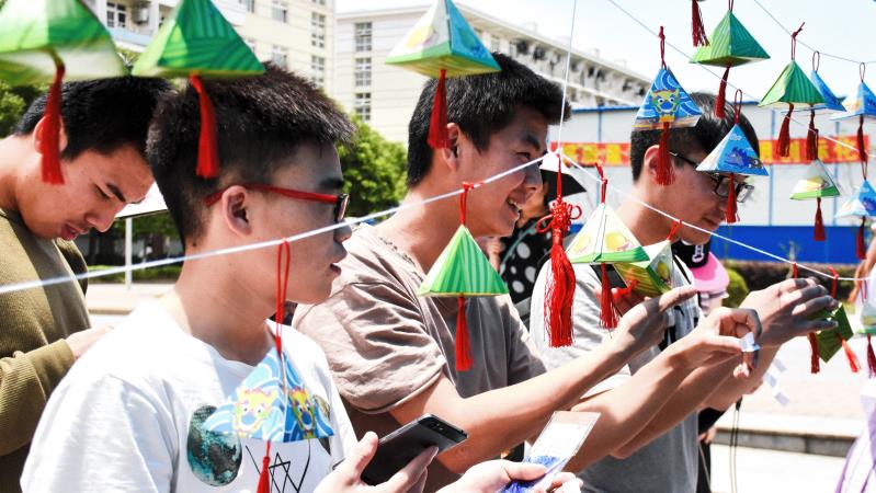 此外,各学院以端午节为契机,组织开展了形式多样的端午节活动。机械工程学院、管理学院开展了“四人五足赛龙舟”、“端午元素你画我猜”、夹弹珠、猜灯谜、套圈等活动,充分展示端午节这一传统节日的生机与魅力;汽车工程学院、材料工程学院、航空运输学院、艺术设计学院、外国语学院等开展了端午节知识问答、端午节诗词大会、制香囊赠师友、编织五彩绳、“习楚辞”现场书法等文娱活动,带领同学们走进传统文化,感受民俗风采;电子电气工程学院将学生生活园区文化建设与“端午插艾”的传统习俗相结合,为表现突出的寝室悬挂香囊和艾叶,鼓励同学们重视园区和宿舍文化;服装学院的志愿者们则充分发挥专业优势,在青浦怡澜小区开展“粽情岁月——绿色扎染庆端午”主题志愿活动,借助绿色环保颜料和废旧面料开设手工扎染小课堂,带领居民们制作出以粽子为原型的扎染印花作品,融传统于专业实践当中;社会科学学院为大一少数民族学生举办的“端午茶话会”,让少数民族学生们感受到了家的温暖;中法学院举办了端午义卖嘉年华活动,让同学们在献出一份爱心的同时还能收获端午节的礼物,并将义卖活动的全部收入捐助给仙霞街道的贫困家庭。