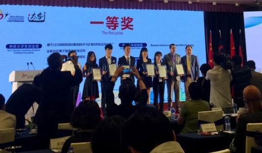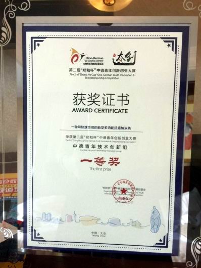 本次大赛设立中德大学生创业组、中德青年创客组和中德青年技术创新组,共有来自中国、德国、美国等国家的295个项目参赛,吸引国内东南大学、西北工业大学、中南大学、苏州大学、南京航空航天大学等诸多高校的优秀作品参赛,涉及高端装备制造、新材料、生物医药、“互联网+”等领域。经过前期的激烈竞争,78个项目入围决赛,围绕各自的项目成果进行了展示和汇报。经过作品提交、个人答辩、专家现场提问及评审等环节,由我校化学化工学院刘锡建、陆杰老师指导的任兰芳、王烨颖、黄智、闫大同学申报的项目《一种可快速合成的新型多功能抗癌纳米药》一举获取大奖。