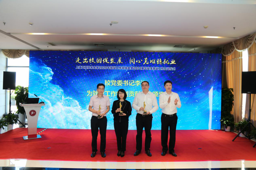 会上,校党委书记李江为长宁人社局、松江人社局和G60科创走廊联席办公室颁发了2020年学校就业工作特别贡献奖,为华虹集团上海华力公司、上海建工集团、上海电气集团、东方国际集团、东航技术有限公司、上海地铁维保公司等十佳用人单位颁奖。2020年,学校坚持党委统筹领导,将“促就业、保民生”作为首要政治责任,统筹各方力量和资源,共筑“就业共同体”,形成了全员发动、全员参与的就业一盘棋。在这场就业大考中,学校充分发挥党员师生的先锋模范作用,用行动践行使命担当,交出了令人满意的答卷,取得了较好的成绩。