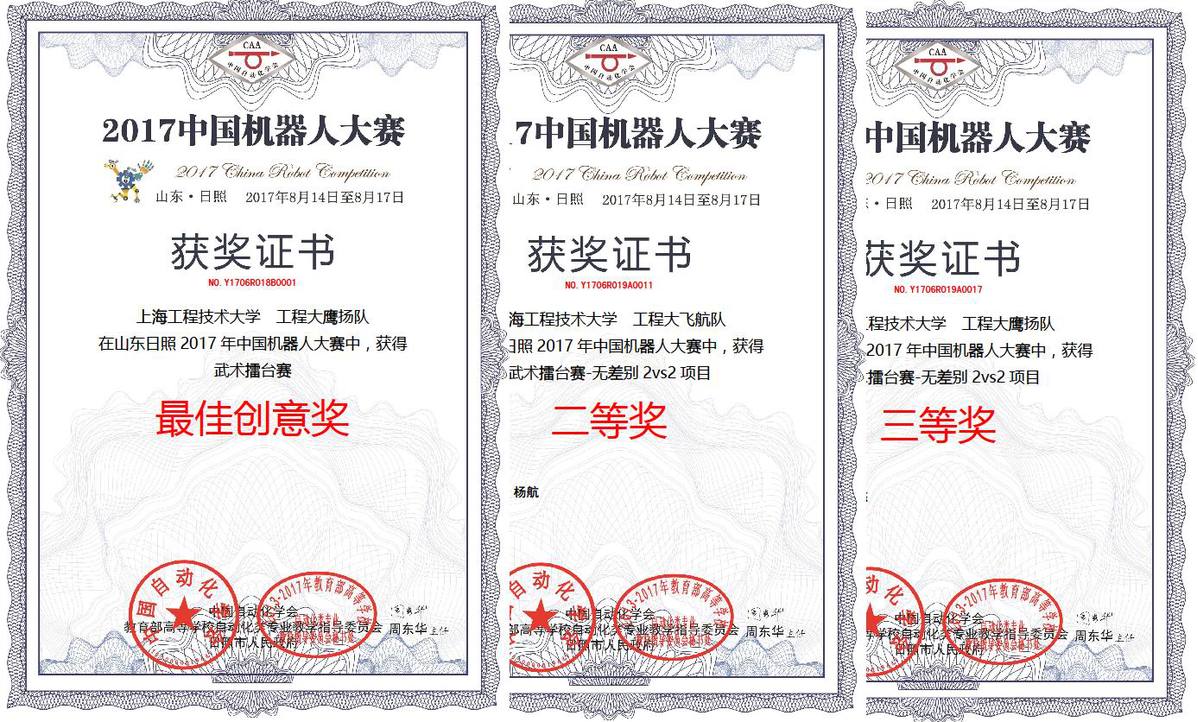 近日,2017中国机器人大赛在山东日照开赛。我校首次派出代表队参加大赛的武术擂台赛无差别2VS2项目比赛,经过激烈的角逐,“工程大飞航队”和“工程大鹰扬队”分别获得了武术擂台赛无差别2VS2项目全国二等奖和全国三等奖,其中“工程大鹰扬队”还荣获本次比赛的最佳创意奖。