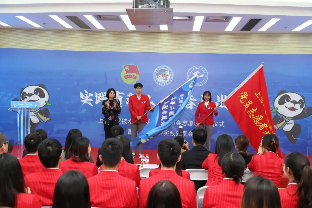 校党委副书记、副校长朱晓青为我校第三届进博会党员志愿者先锋队以及志愿者服务总队授旗。