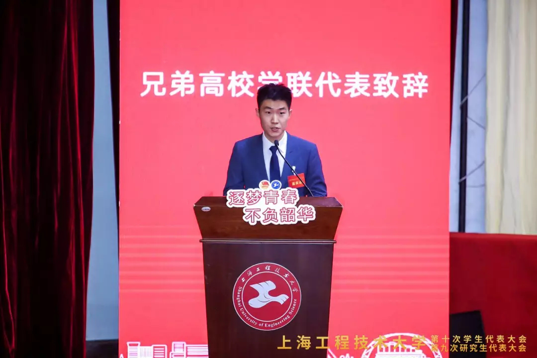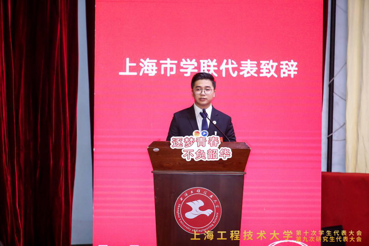 上海市学联驻会执行主席杨君宇同学代表市学联致辞。鼓励同学们志存高远,心有所信;关心社会,担当家国;要练就本领,脚踏实地。上海交通大学主席团成员臧奕茗代表兄弟院校发言;我校王泽林、褚赵超同学,向大会作第九届学生会、第八届研究生会工作报告;全国学联第二十七次代表大会代表、城市轨道交通学院孙迪同学,带领与会代表共同学习了习近平总书记致全国青联十三届全委会和全国学联二十七大的贺信精神。