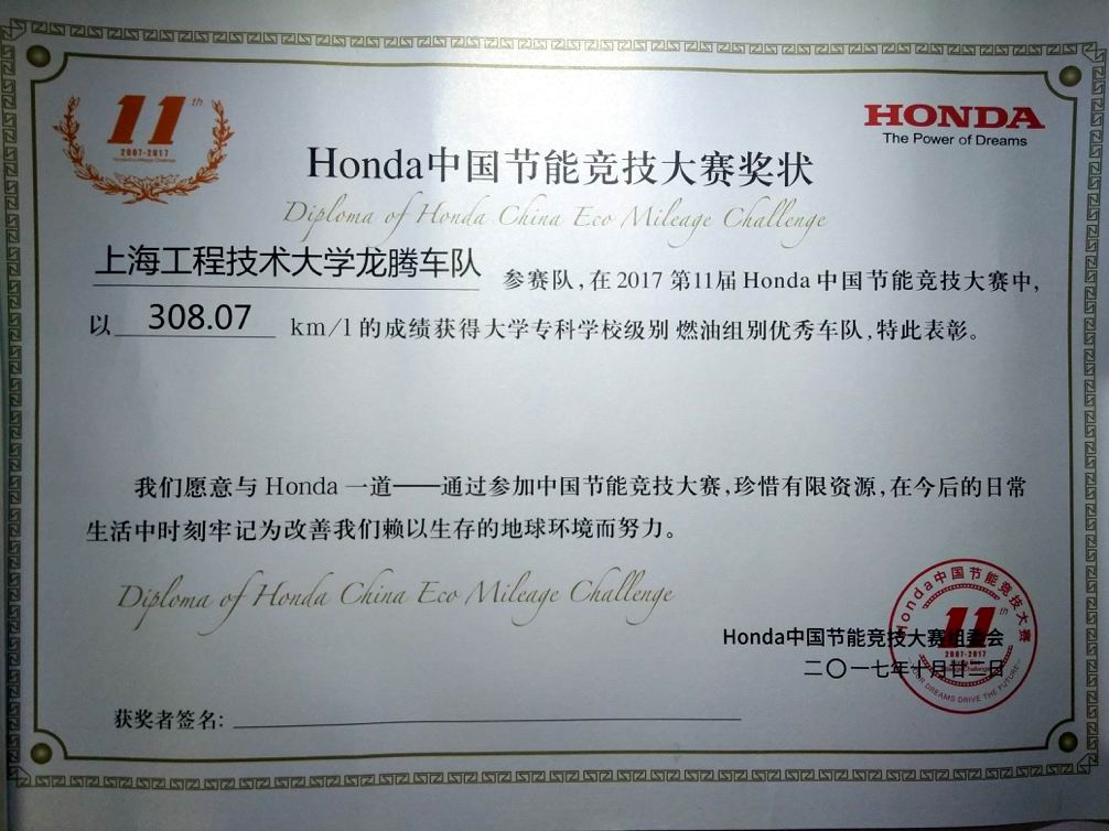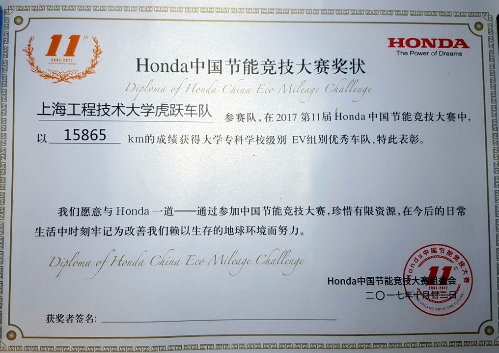 10月21日,第十一届HONDA中国节能竞技大赛以“挑战一升,节能一生”为主题,在广东国际赛车场盛大举行。经过正式比赛、专家现场评审等环节的激烈角逐,在指导老师及全体队员的共同努力下,我校汽车工程学院虎跃节能赛车队和龙腾节能赛车队分别荣获电动组第6名(全国共计45支参赛队)、燃油组第8名(全国共计66支参赛队)的好成绩,并因赛车的优秀设计和团队的技术实力,两支车队双双荣获大赛评委组颁发的“优秀车队奖”。