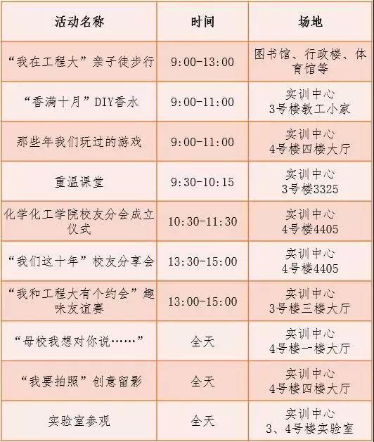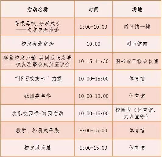 亲爱的校友们,您的母校将在10月28日(周六)迎来建校39周年校友返校日,活动内容精彩丰富,各类成果展览、“程二代”亲子体验活动、社团巡礼,还有各个学院为校友定制的各类活动,总有一款适合您。无论是好友相聚回首青春,还是家庭之旅亲子互动,“最美校园”等待您的到来。