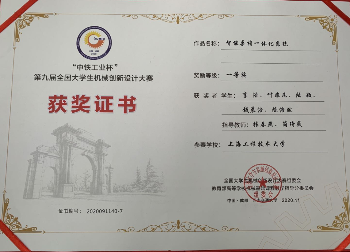 11月20日至23日,2020“中铁工业杯”第九届全国大学生机械创新大赛决赛在西南交通大学犀浦校区落下帷幕。由我校机械与汽车工程学院张春燕、简琦薇两位老师指导,钱晨浩、李浩、陈浩然、叶非凡、陆颖五位同学设计制作的“智能桌椅一体化系统”一路披荆斩棘,经过四次PK最终斩获全国一等奖。