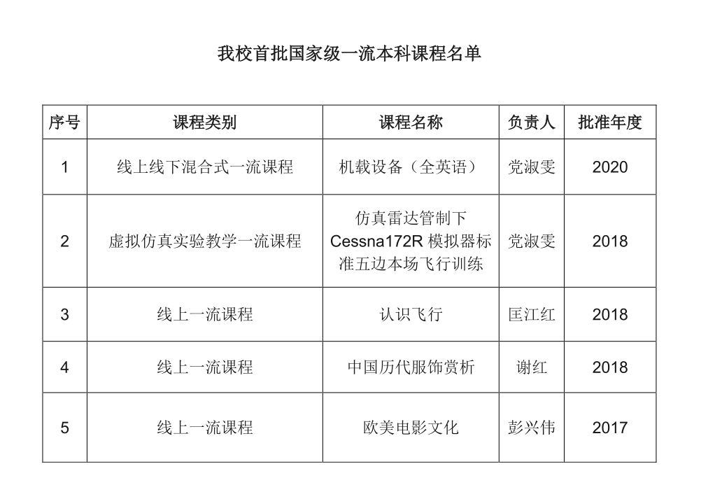 近日,根据《教育部关于公布首批国家级一流本科课程认定结果的通知》(以下简称《通知》),我校航空运输学院党淑雯老师负责的《机载设备(全英语)》课程获评线上线下混合式国家级一流本科课程。根据《通知》精神,我校目前共有5门课程被认定为首批国家级一流本科课程,含2017年度、2018年度获批的3门国家精品在线开放课程和1门虚拟仿真实验教学课程。