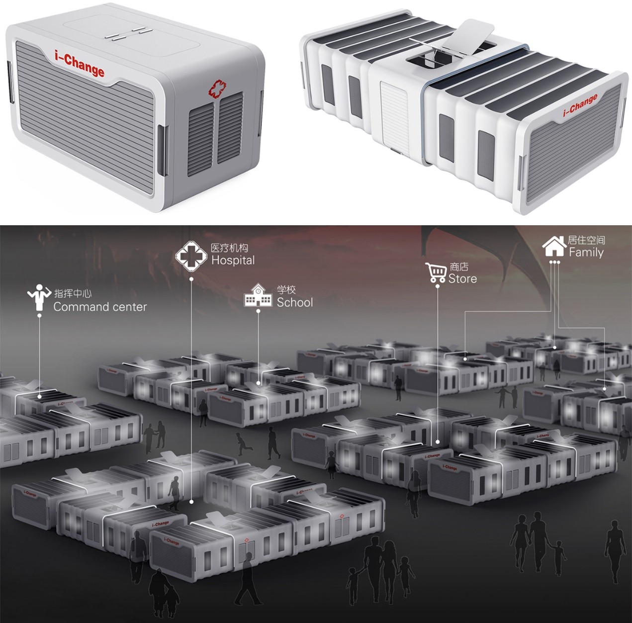 《i-Change太阳能灾区组合帐篷设计》在帐篷的顶部融入CIGS太阳能柔性薄膜电池,可为帐篷提供电量,为灾区的医疗、临时学校、救援指挥中心及生活居住空间提供照明及其他电力所需,环保实用。此套设计采用组合的概念,以单一模块,拉伸后可组合成像“四合院”一样的空间,提倡“家”的概念,它方便运输,且便于组装,能更好地规划空间,更方便人们之间的沟通交流,它不仅设计人性化,更体现了对灾区人民的情感关怀。