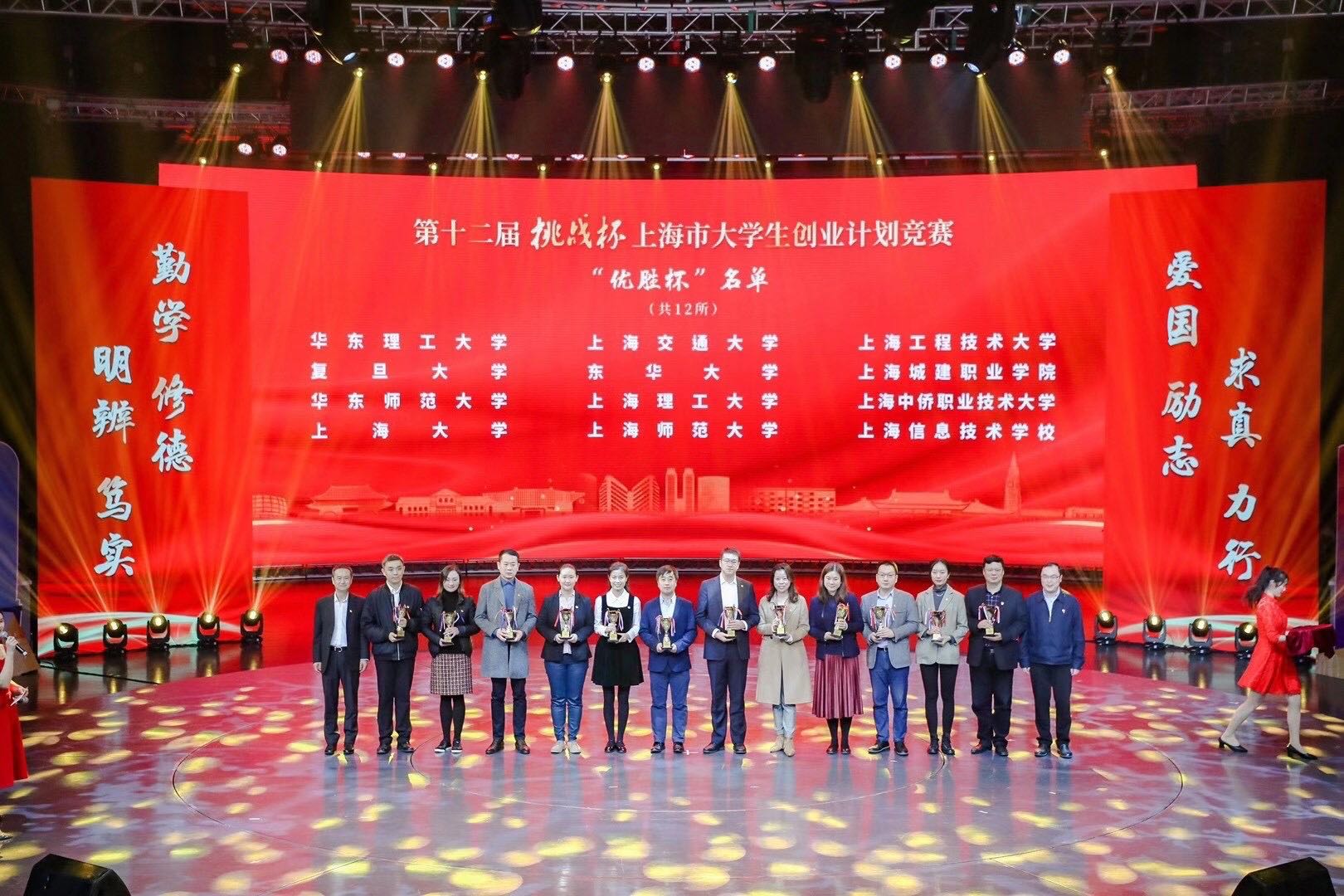 同时,第十二届“挑战杯”上海市大学生创业计划竞赛颁奖仪式在“坚定跟党走奋进新时代”——上海学子纪念“一二•九”运动85周年主题集会上举行。经过校内选拔赛、上海市复赛的层层考验,我校学生创业项目共摘得1项金奖、8项银奖、20项铜奖,荣获“优秀组织奖”,续捧“优胜杯”。