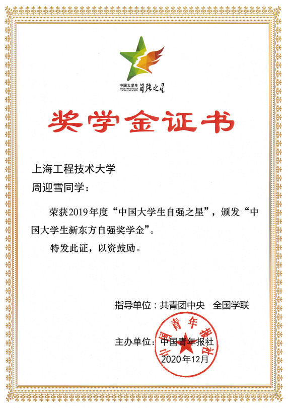 近日,管理学院2018级工商三班研究生周迎雪同学被共青团中央、全国学联授予2019年度“中国大学生自强之星”称号,并荣获“中国大学生新东方自强奖学金”。