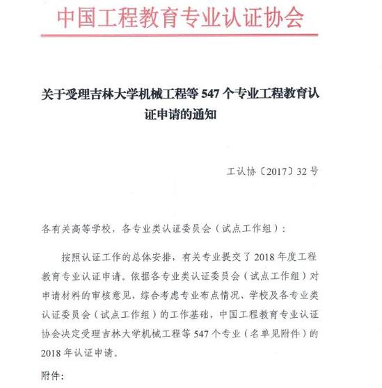 近日,中国工程教育专业认证协会发布《关于受理吉林大学机械工程等547个专业工程教育认证申请的通知》(工认协〔2017〕32号),我校环境工程、交通运输、服装设计与工程、化学工程与工艺等4个专业,在数千个申报专业中脱颖而出,被中国工程教育专业认证协会成功受理。