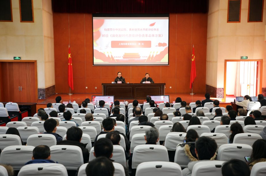 蒋红巡视员从 “为什么改”“改什么”“怎么改” 三个问题出发,深入浅出地就《总体方案》出台的背景和意义进行了全面阐释。从党委政府、学校、教师、学生、用人单位等五方面对《总体方案》“五破五立”的特点和基本定位作了说明,并就指导思想、主要原则、改革目标、重点内容等方面对《总体方案》进行了详尽解读。同时,他对上海市如何贯彻落实《总体方案》从党委和政府教育工作评价改革、学校评价改革、教师分类评价改革、学生综合素质评价改革、用人评价改革等六大专项行动作了全面介绍,并对学校下一步工作提出了建议意见。