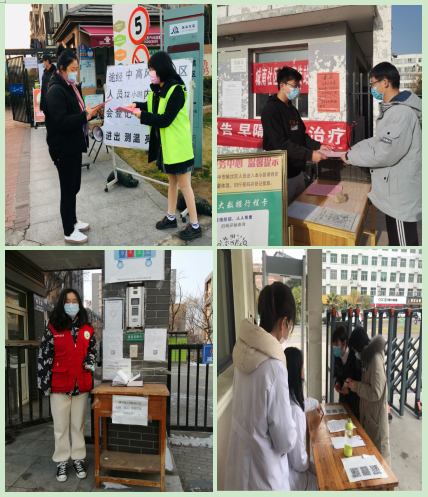 化学化工学院环境工程学生党支部党员及入党积极分子也积极加入街道、社区疫情防控志愿服务活动,成为社区疫情防控的一道靓丽风景。曾参与进博会志愿者的金怡彤同学返乡后积极报名“盛京义勇”志愿者并成为一员,担任了所在社区24个楼栋的上门排查工作;入党积极分子张硕寒假返乡后严格遵守家乡疫情防控七天居家隔离政策,隔离期满后马上报名参加了社区执勤卡点志愿者,和居委会工作人员一起认真排查登记过往车辆、人员,助力社区疫情防控;热心公益事业的邵心怡同学积极参与到了社区珠溪志愿服务队,担任社区文明劝导、疫情防控宣传、居民信息核实工作任务;周旸同学返乡后得知地方疾病预防控制中心招募防疫志愿者的信息后,第一时间主动报名,承担了对进入医院人员进行体温测量、查看健康码、基本信息登记、提供咨询服务等工作任务。