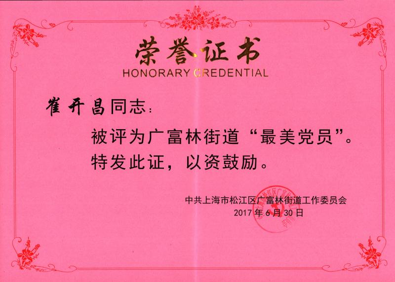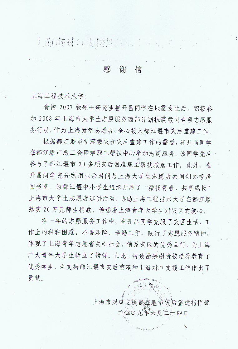 崔老师在志愿服务期间,尽心尽力,因此获得了许多荣誉,包括:都江堰市“5.12”抗震救灾优秀志愿者、都江堰市抗震救灾及灾后重建特别贡献奖、成都市优秀青年志愿者……。在志愿服务期满的时候,鉴于崔老师在志愿服务期间的工作表现,上海市对口支援都江堰市灾后重建指挥部还向学校发来感谢信,并为包括崔老师在内的上海20名志愿者举行了欢送会。