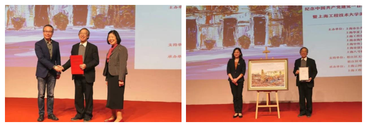 高瞩院长为陈燮君先生颁发上海工程技术大学美育导师聘书。董旖旎书记代表学校受赠作品《土地革命战争中期中央工农民主政府所在地——江西瑞金》。