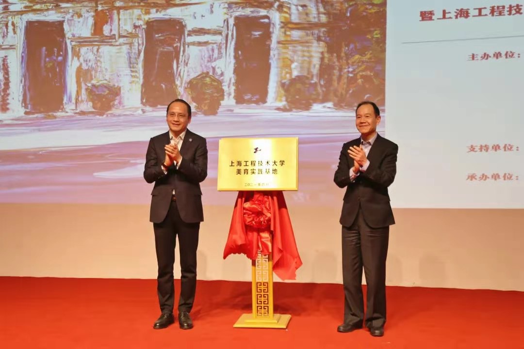 俞涛校长、韦源会长为上海工程技术大学美育实践基地揭牌,并参观了艺术设计学院学生毕业设计作品展。