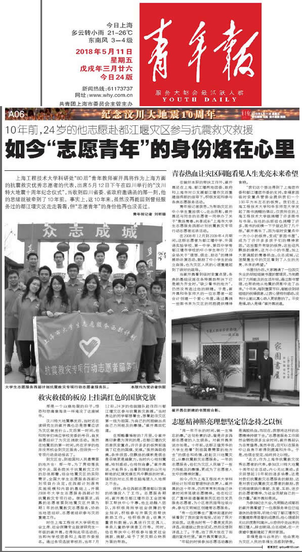 上海工程技术大学科研处“80后”青年教师崔开昌将作为上海方面的抗震救灾优秀志愿者的代表,出席5月12日下午在四川举行的“汶川特大地震十周年纪念仪式”,当收到四川省委、省政府邀请函的那一刻,他的思绪就被牵到了10年前。事实上,这10年来,虽然没再能回到曾经服务过的都江堰灾区走走看看,但“志愿青年”的身份他再也没丢过。