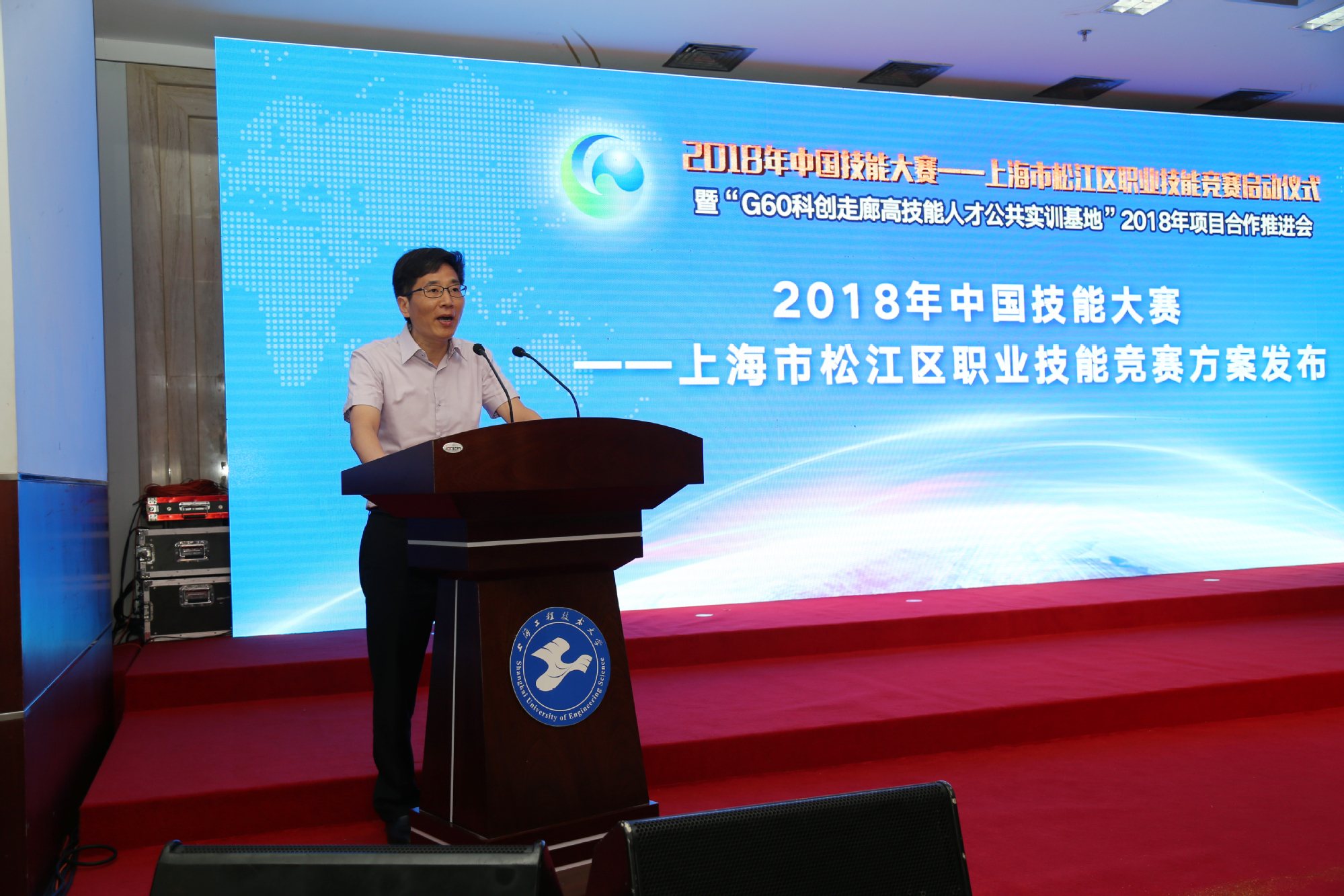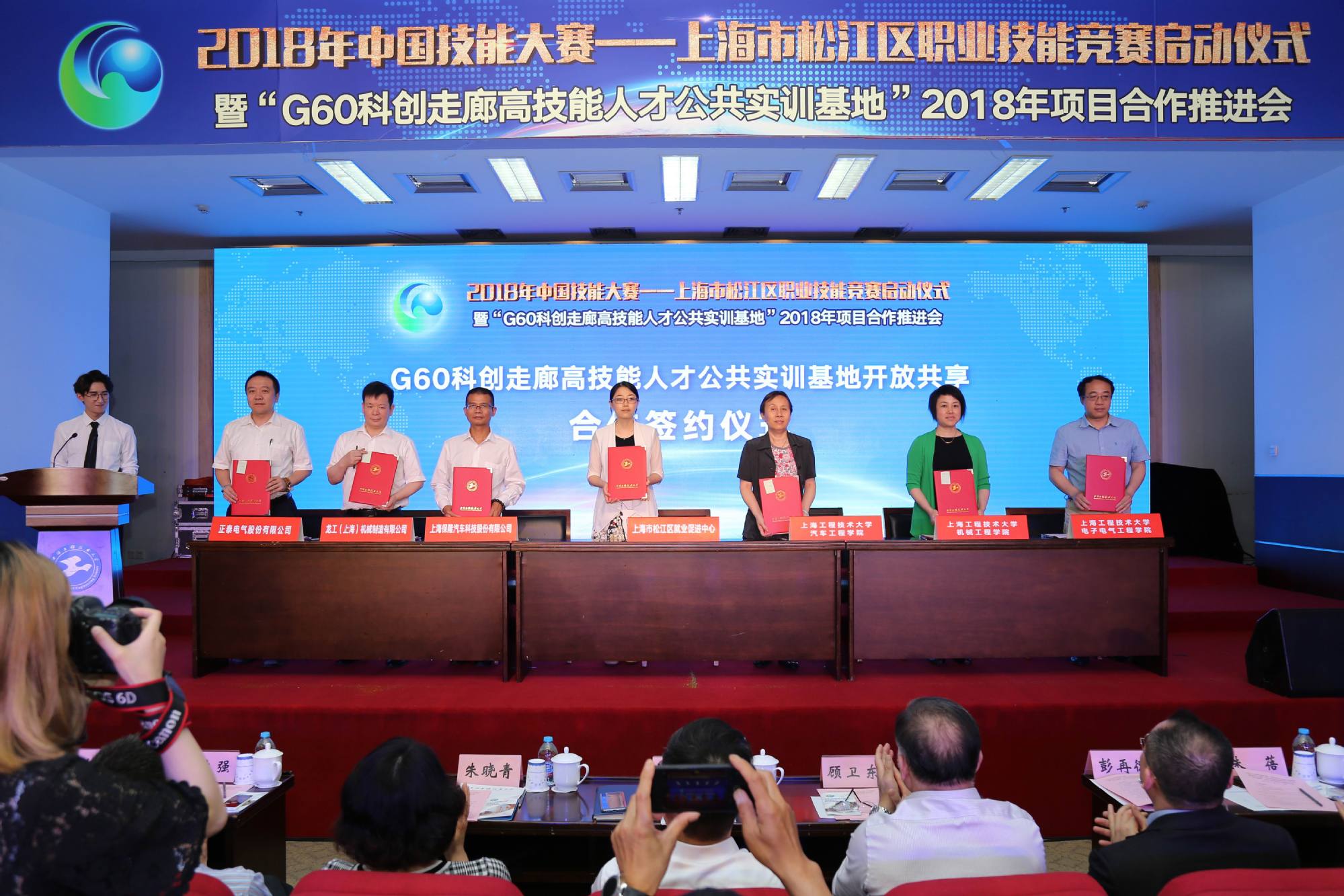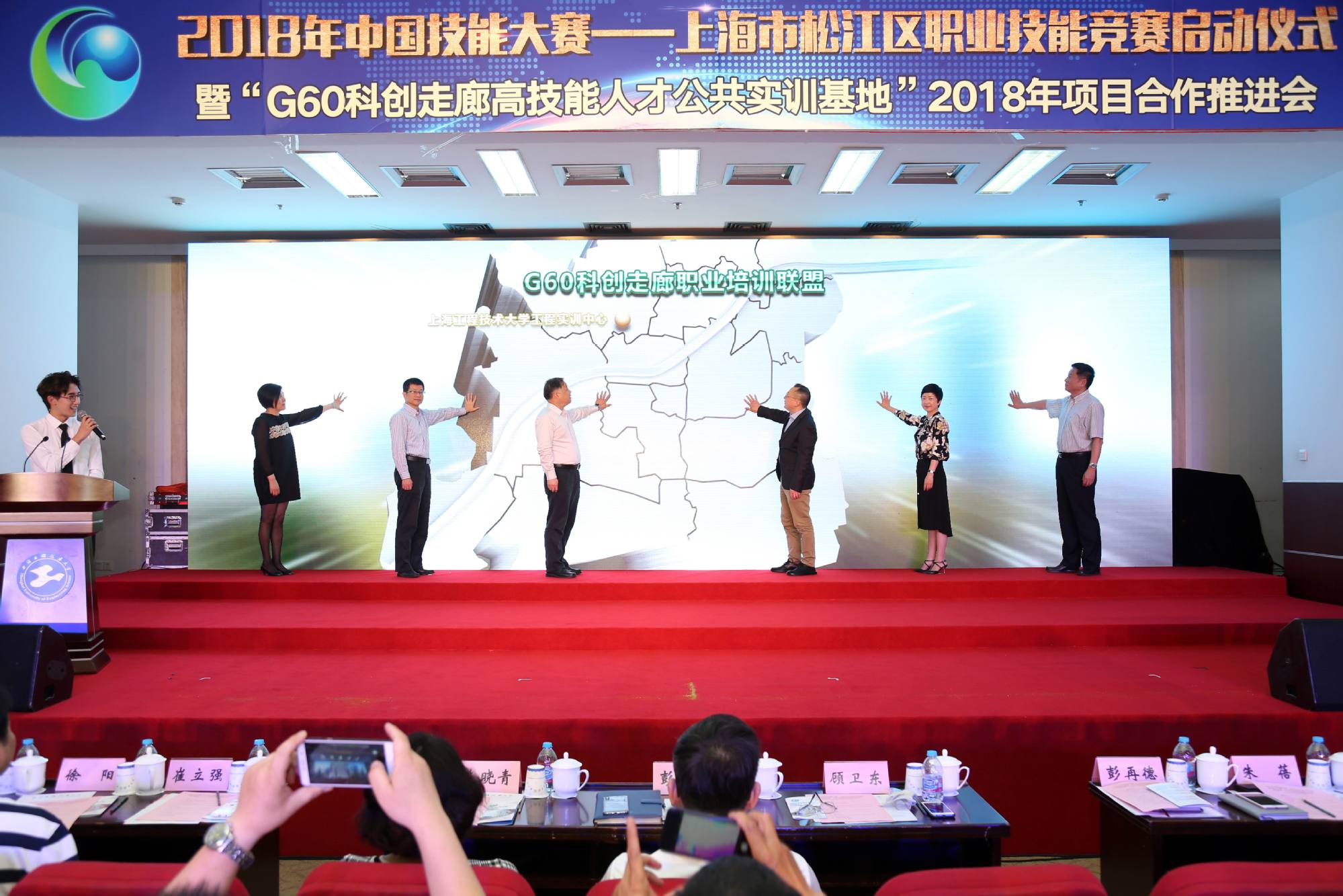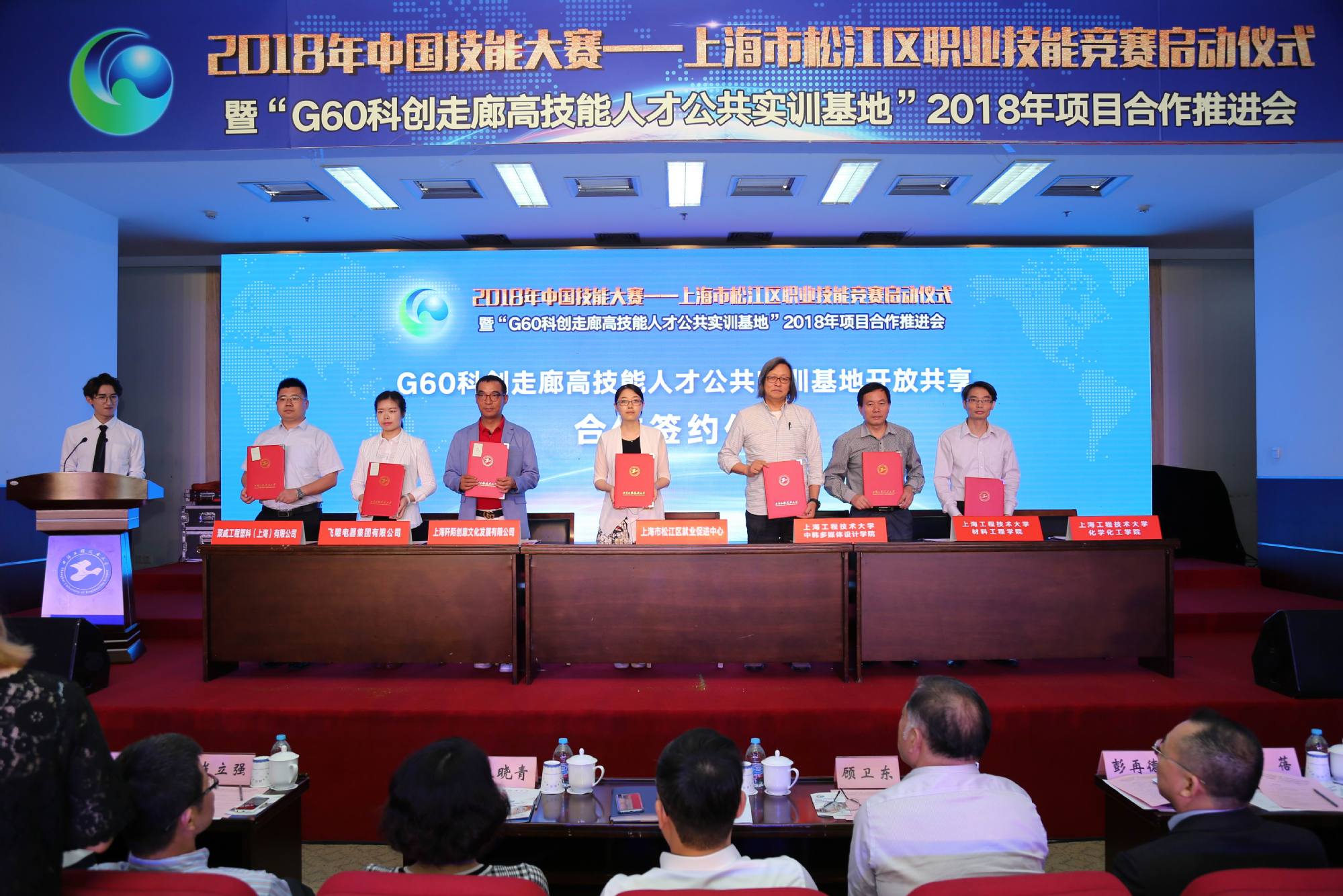 为深入落实区校合作,持续推动我校与松江区人力资源和社会保障局共建的“G60科创走廊高技能人才公共实训基地”项目不断深化,5月15日上午,2018年中国技能大赛--上海市松江区职业技能竞赛启动仪式暨“G60科创走廊高技能人才公共实训基地”2018年项目合作推进会在我校松江校区图文信息中心第二报告厅举行。中共上海市松江区委常委、组织部部长彭琼林,上海工程技术大学党委副书记、副校长朱晓青,上海市人力资源和社会保障局职业能力建设处处长顾卫东,上海市职业技能鉴定中心党支部书记崔立强,上海市就业促进中心职业培训处副处长宋丽萍,松江区人力资源和社会保障局局长彭再德,以及我校相关职能部门、学院负责人出席活动。