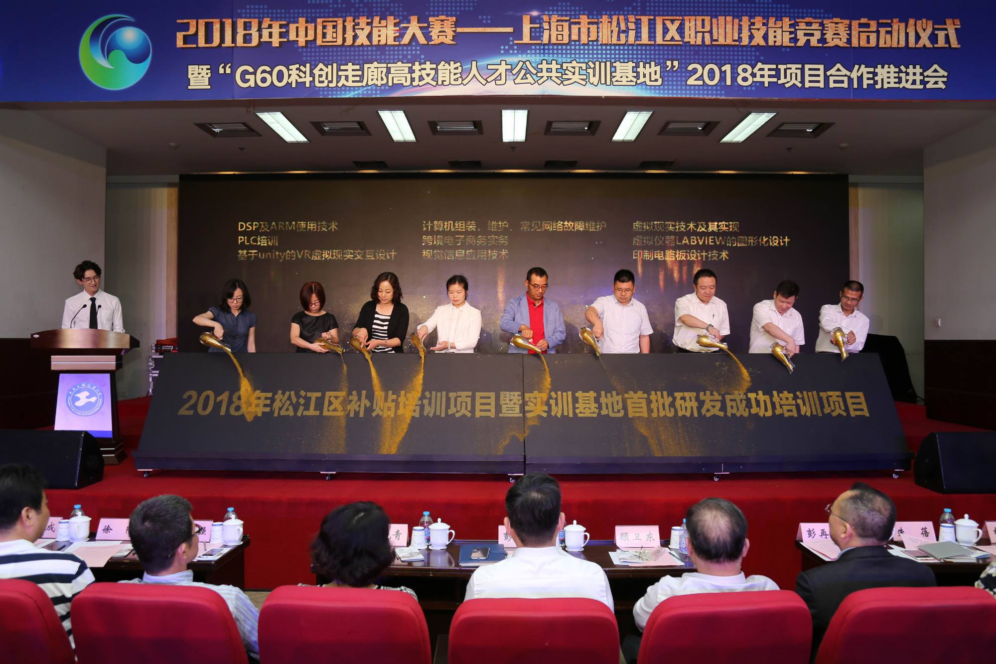 活动中,上海工程技术大学工程实训中心和松江区人力资源和社会保障局分别对“G60科创走廊高技能人才公共实训基地”首批研发成功的G60科创走廊职业培训项目和2018年松江区职业技能竞赛方案进行发布。我校相关学院与9个G60科创走廊企业、松江区就业促进中心分别签订了《G60科创走廊高技能人才公共实训基地开放共享协议》、《共同建立产学研合作教育见习基地协议》,标志着实训基地首批校、企、政府三方合作项目落地。活动还启动了“G60科创走廊职业培训联盟”和2018年松江区职业技能竞赛。