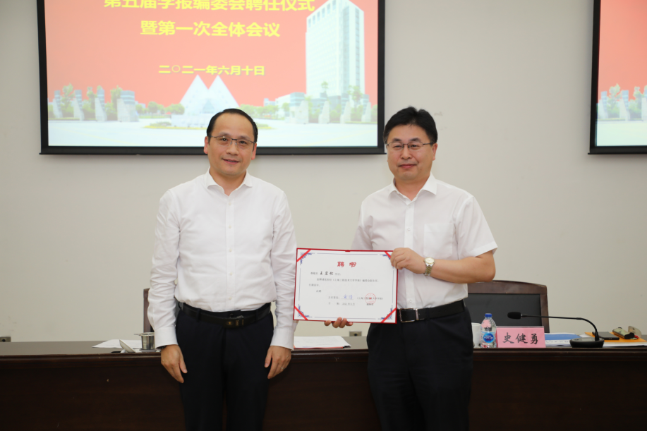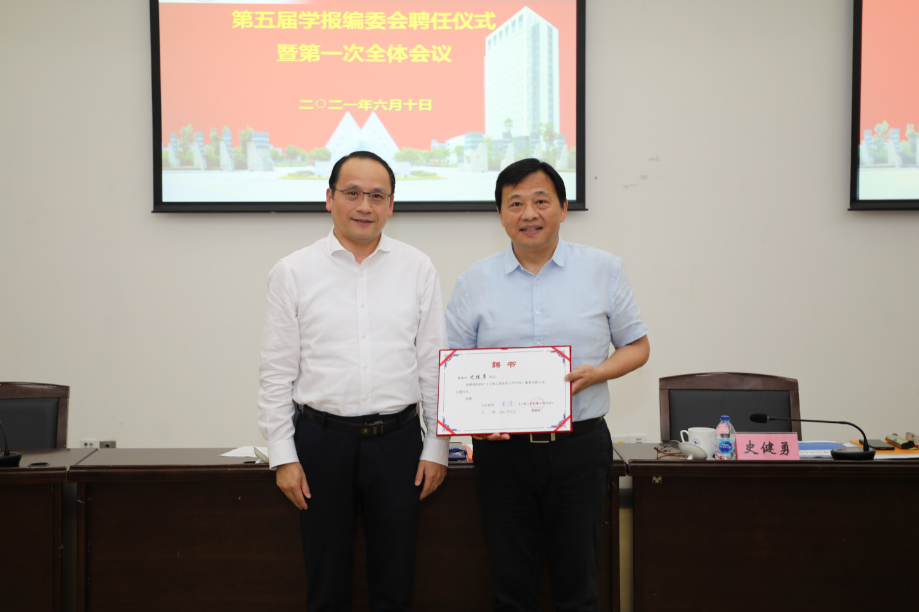 会上,党委副书记、编委会副主任史健勇宣读了学报第五届编委会组成人员名单。本届编委统筹考虑年龄结构与专业分布,同时吸纳一定比例的校外专家,最终确定了25名编委委员。俞涛校长为受聘编委会组成人员一一颁发了聘书。