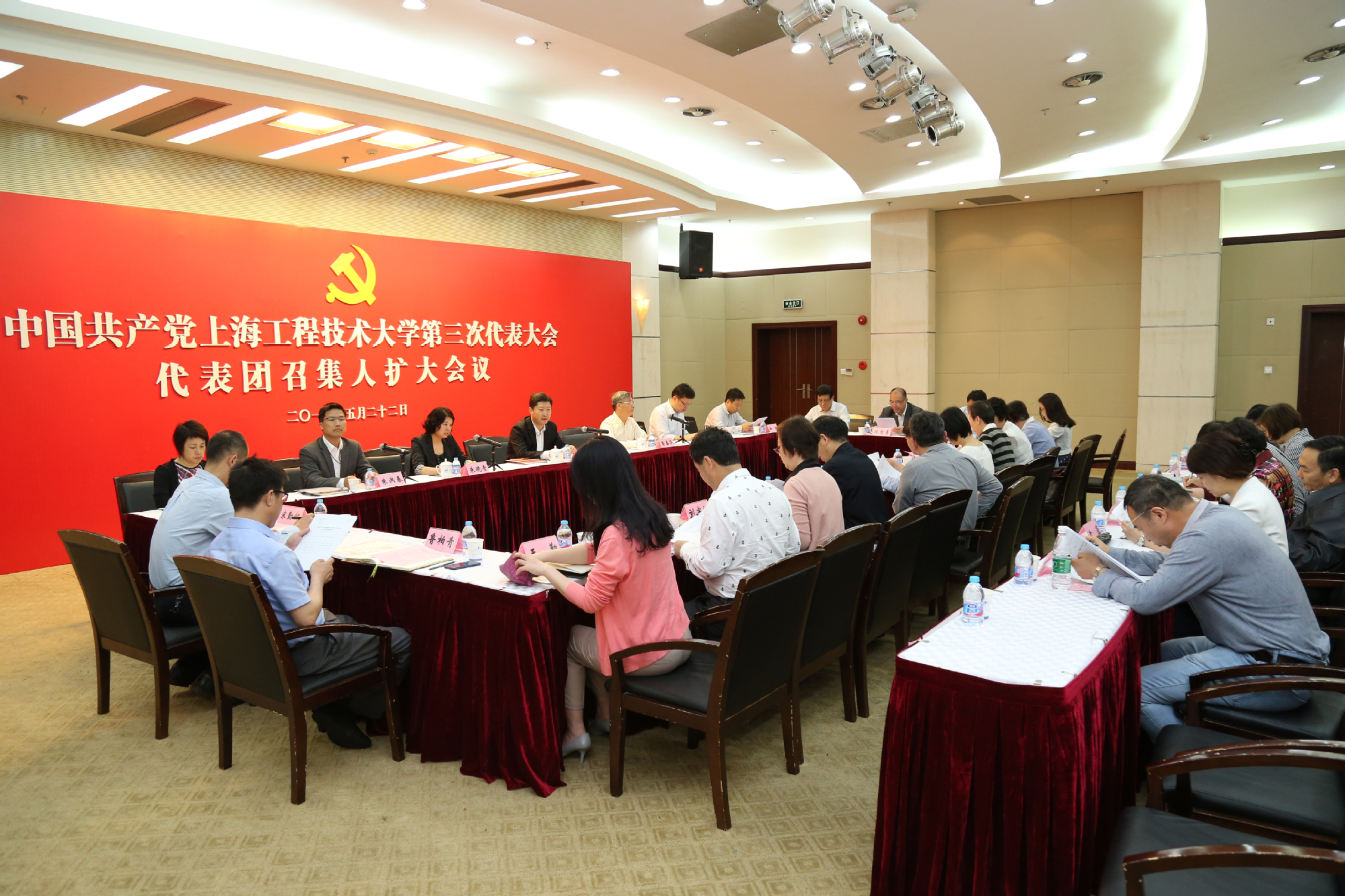 5月22日上午,上海工程技术大学第三次党代会各代表团召集人(扩大)会议在图文信息中心第三报告厅召开。校党委书记李江,校党委副书记、纪委书记鲁嘉华,校党委副书记、副校长朱晓青,各代表团召集人,各二级党组织书记,相关部门负责人出席会议。会议由校党委副书记、副校长朱晓青主持。