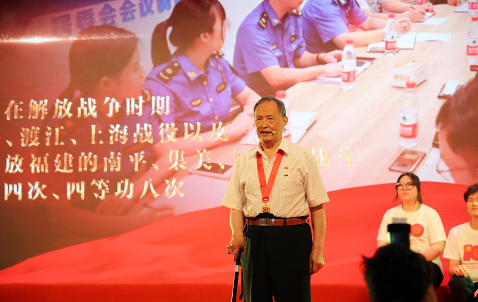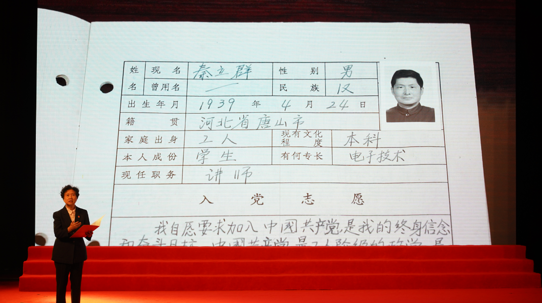 “党的需要就是我的志愿,哪怕再艰苦,再危险的工作自己也一定完成!”这是曾经参与原子弹研究、乘飞机穿过原子弹爆炸的蘑菇云层现场采样的工程大管理学院教师秦立群同志的入党志愿书。在第二篇章中,学校原退休第十党支部书记顾惠云同志现场讲述了秦立群老师的感人事迹。二十多年里,他多次参加核试验,并于1985年获颁核工业参加核潜艇实验,长期从事核工业建设荣誉奖状。因为受到辐射,孩子出生便落下残疾,但是在组织欲给予他帮助时,他总说“比我困难的还有很多,要先帮他们”。虽然秦老师已离开了我们,他的精神却深深打动现场每一位师生,学校老党员、市教卫党委“两优一先”获得者、戍边卫国的退伍士兵等立足平凡岗位且积极发挥作用的党员们通过集体朗诵《祖国不会忘记》,向以秦老师为代表的无数艰苦奋斗、勇攀高峰、甘于奉献的老一辈共产党员致敬。