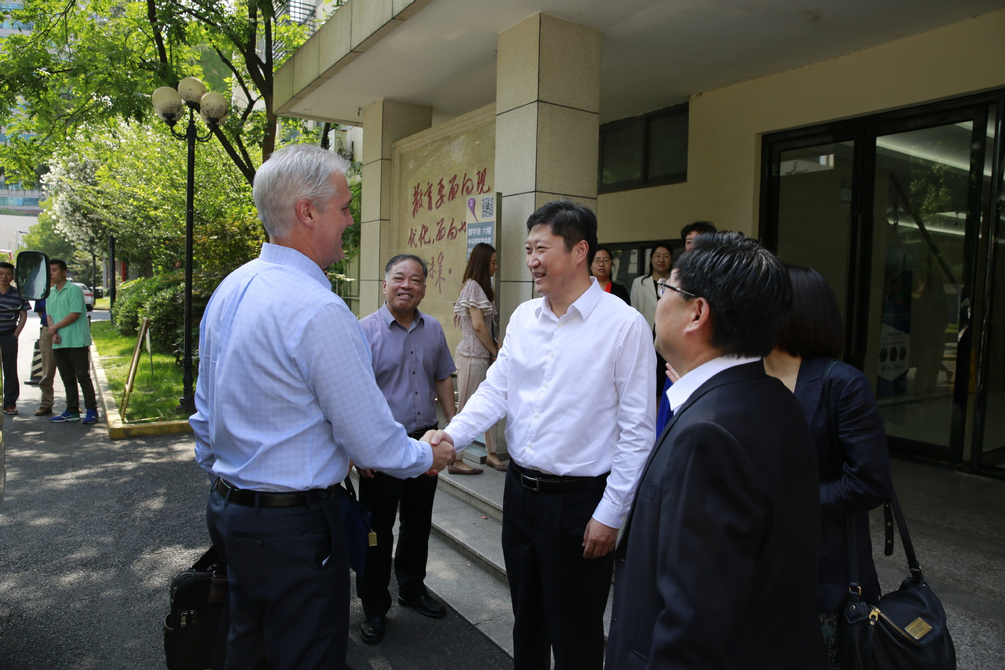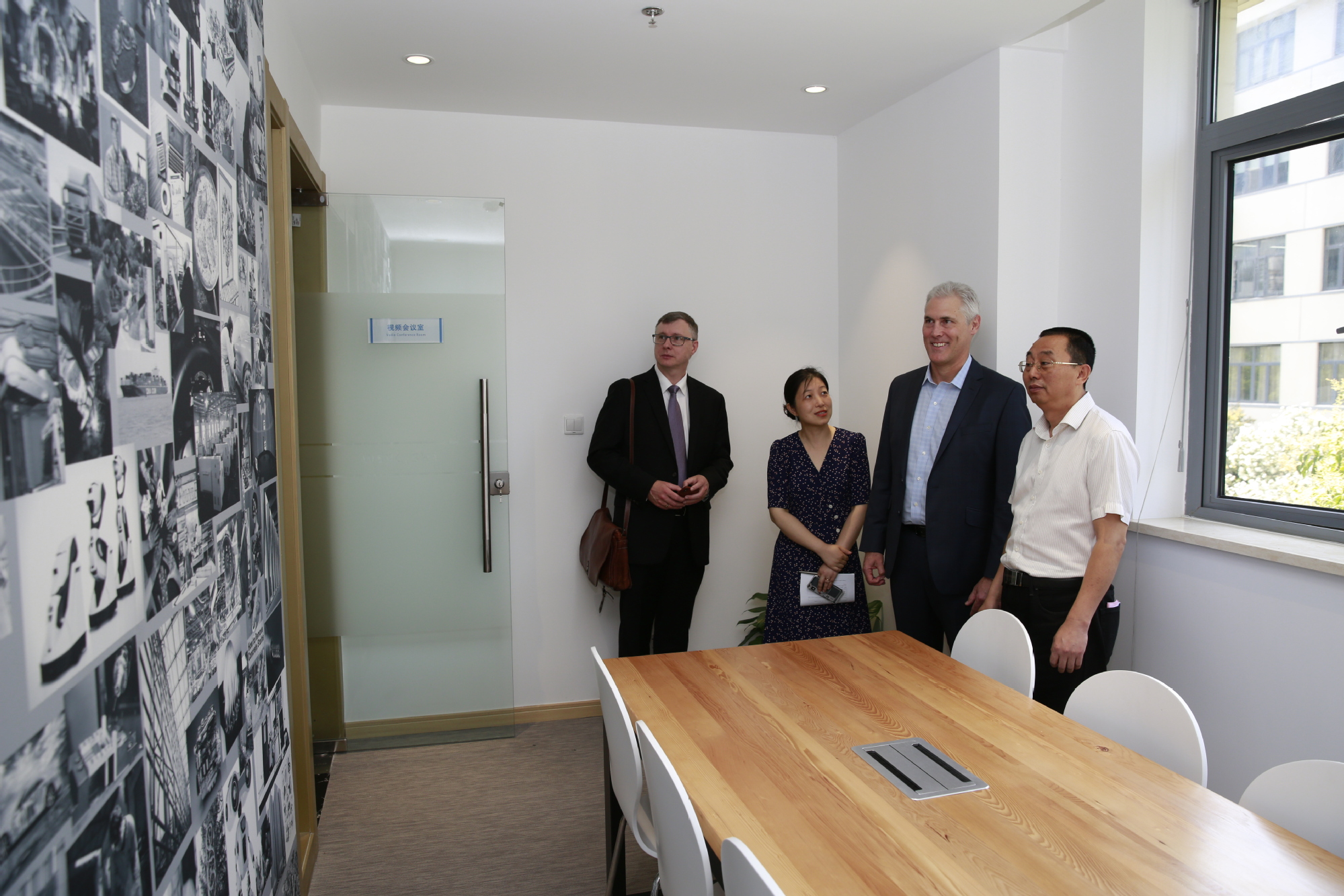 党委书记李江、副校长姚秀平热情接待了大卫•霍伊、张立新司长一行。高职学院党委书记沈海庆、校办副主任王振钧等参加实地考察。李江书记介绍了我校概况,感谢人社部、上海市人社局决定把世界技能大赛中国(上海)研究中心设立在我校,希望世界技能组织、人社部、上海市人社局继续支持与指导研究中心的工作。