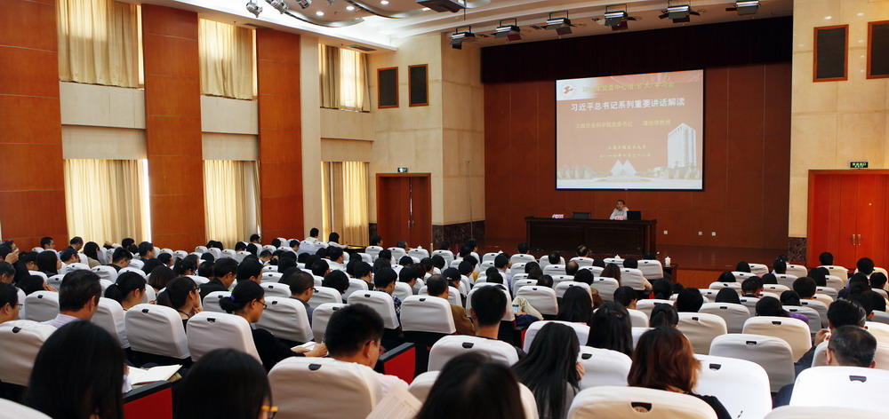 10月28日下午,校院两级中心组(扩大)专题学习会在行政楼B301举行,上海社会科学院党委书记潘世伟教授应邀在会上作了题为《习近平总书记系列重要讲话精神解读》专题辅导报告。校党委书记滕建勇,校长丁晓东,党委副书记夏斯云、裴小倩,副校长孙培雷、程维明、史健勇,中心组成员、中层干部、社会科学学院教师、辅导员共计200余人参加了会议。党委书记滕建勇主持了会议。