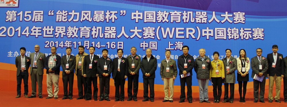 中国科学技术协会青少年科技中心主任李晓亮,中央电化教育馆副馆长、世界教育机器人协会理事长王晓芜,中国科学技术协会青少年科技中心副主任蒙星,副校长鲁嘉华,上海未来伙伴机器人有限公司CEO费旭锋,中国教育装备行业协会秘书长夏国民,教育部教育装备研究与发展中心处长韩军,中国科学技术协会青少年科技中心处长林丽琴,上海市经济与信息委员会装备产业处处长董亲翔,我校机械工程学院院长程武山,机械工程学院党委书记虞蓉,北京理工大学博士生导师机器人研究中心主任陆际联,清华大学机器人控制实验室——WER比赛规则研究机构主任赵明国,能力风暴品牌总经理兰之君等等出席本次大赛开幕式。中央电化教育馆副馆长、世界教育机器人协会理事长王晓芜和我校鲁嘉华副校长在开幕式上致辞,中国科学技术协会青少年科技中心主任李晓亮宣布大赛正式开幕。