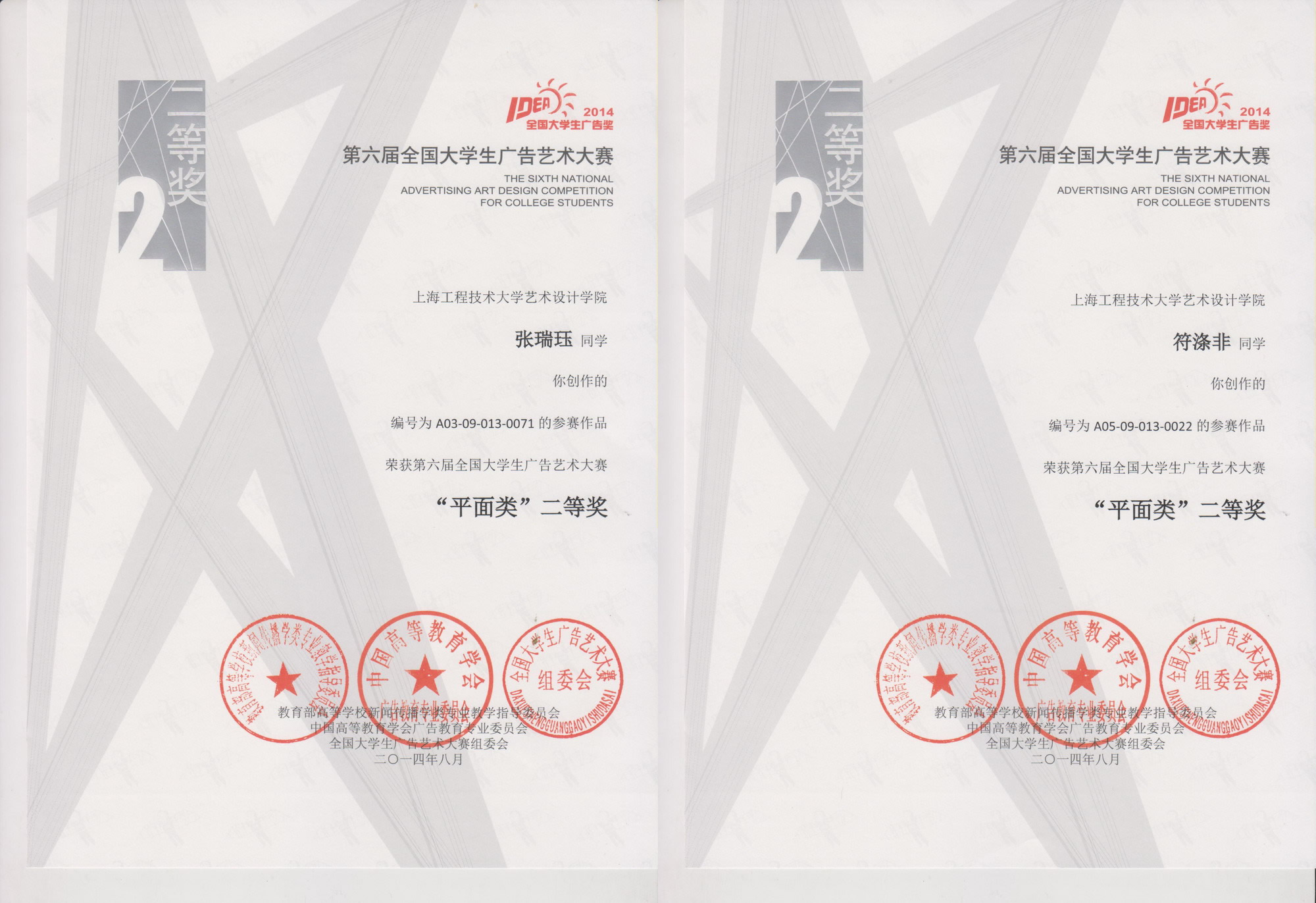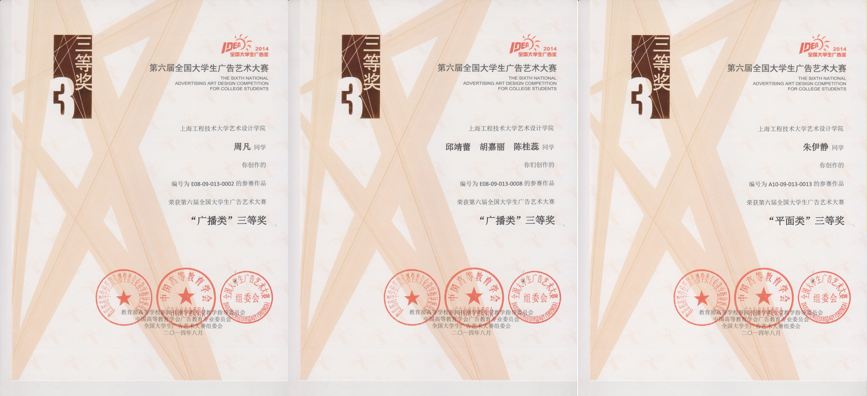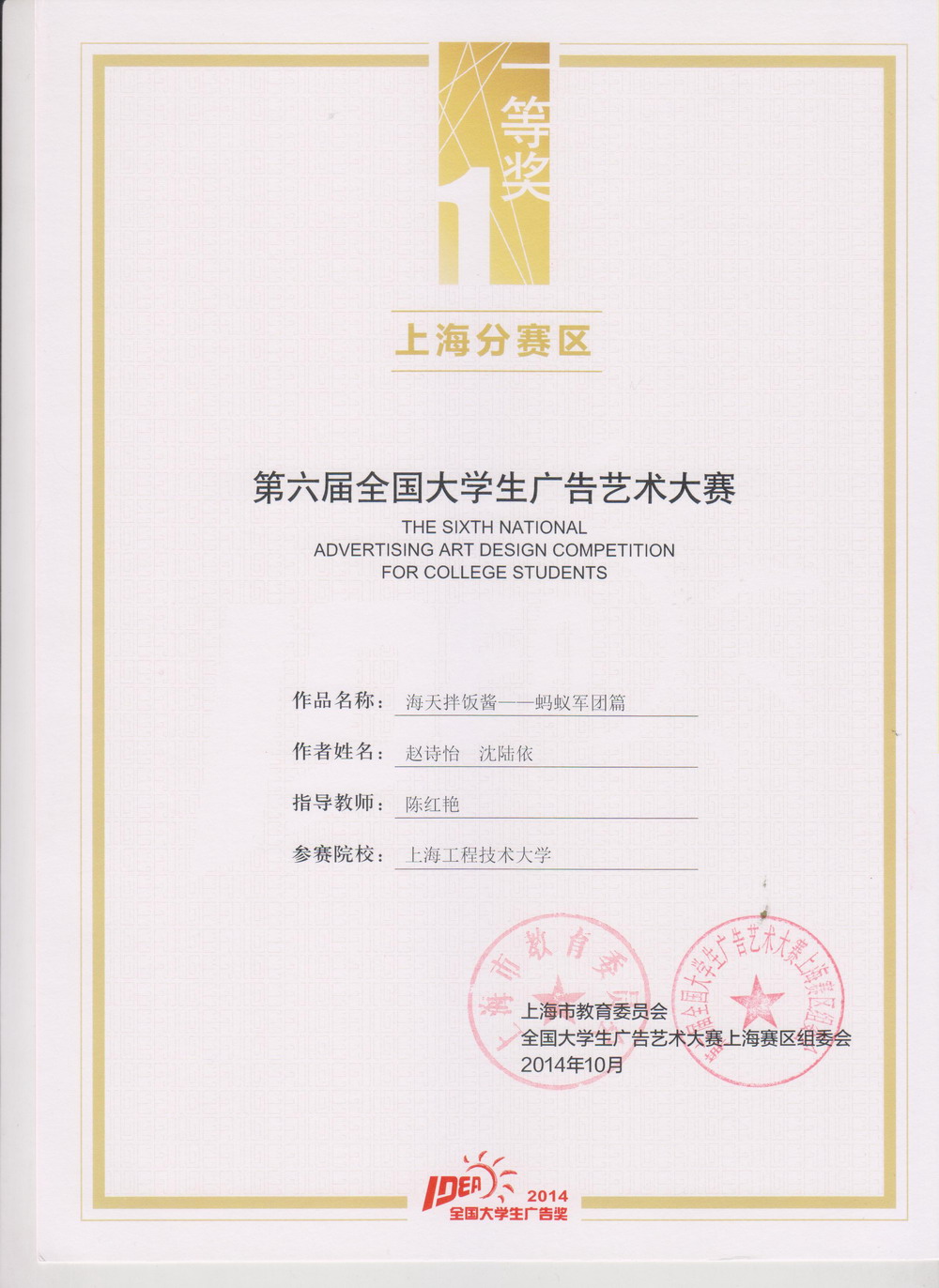 由教育部主办的第六届全国大学生广告艺术大赛获奖名单刚刚揭晓,我校艺术设计学院师生再创佳绩,斩获全国二等奖2项,全国三等奖3项,全国优秀奖15项。加上此前在上海赛区的评选中,艺术学院师生夺得一等奖1项,二等奖5项,三等奖11项,优秀奖70项,优秀指导教师奖1项,我校师生的获奖等级和比例在上海高校以及全国同类高校中都名列前茅。