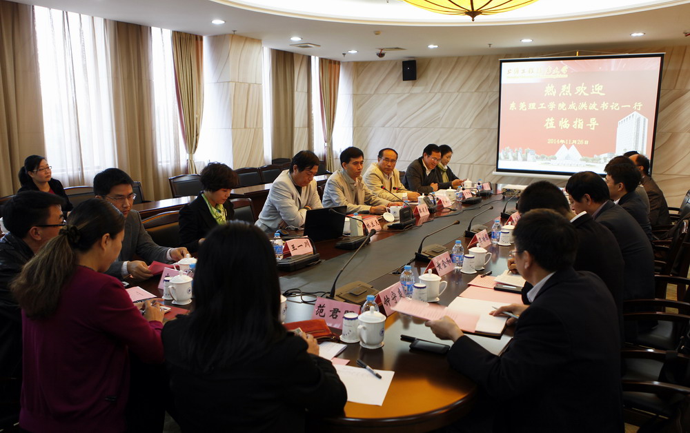 东莞理工学院党委书记成洪波首先对我校热情接待表示诚挚的感谢,并就东莞理工学院的发展历程、学校特色、学校规模及学科建设等方面做了详细的介绍。他表示此次来访是抱着多听、多看的心态来我校交流学习,并对我校二级管理、重心下移、机关转变作风等做法表示认同,希望进一步加强交流和沟通。