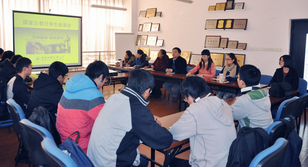 部分师生代表还在师生活动中心A401举行了南京大屠杀国家公祭日纪念座谈会。学生工作部(处)副部(处)长严运楼、机械工程学院副书记梅元媛、艺术设计学院副书记李云先、学院辅导员和学生代表参加了座谈会。严老师与在座师生一起回顾了77年前南京大屠杀惨痛的历史,列举了一些历史史实和日本侵略者在华暴行。他表示,以国家公祭的形式缅怀死难者,不忘历史、汲取教训,有助于把握现在,开拓未来,具有很大的历史和现实意义,一是体现了对死难同胞生命的尊重和告慰;二是对世界和平的祈望和维护;三是对否认南京大屠杀的势力进行了有力回击,以国家立法公祭的形式对日本右翼势力形成压制。与会的同学与老师结合以往参观南京大屠杀纪念馆的经历和观看的史料,交流了感想,表示要切实增强忧患意识、责任意识和大局意识,把个人的理想和追求融入到国家强盛、民族振兴的伟大事业中去。