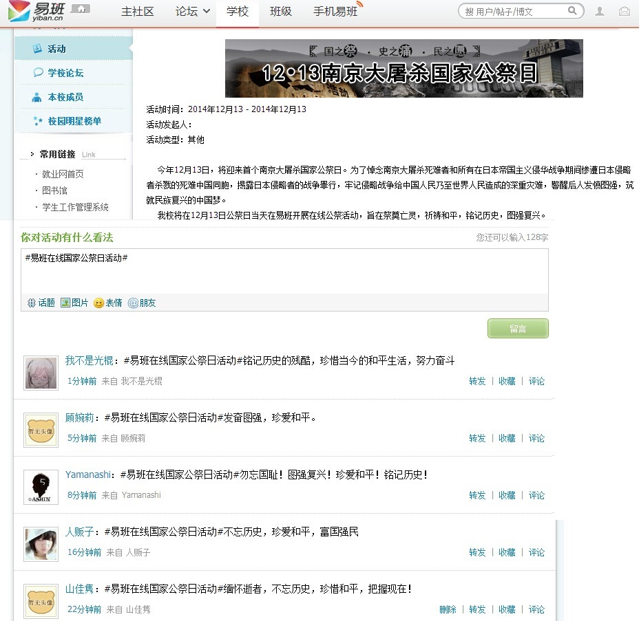 公祭日当天,学生工作部(处)易班发展中心开通了在线公祭平台,组织对南京大屠杀死难者的在线公祭活动。师生纷纷在易班上献花祭奠,发帖留言,缅怀死难同胞。