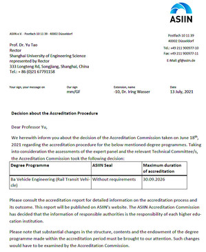 7月13日,我校车辆工程(城市轨道交通车辆)专业收到国际ASIIN认证委员会确认函,确认该专业“无条件”一次性通过ASIIN认证,有效期为6年,这是我校首个开展并通过国际专业认证的专业,标志着学校在专业建设上又取得了重大突破,在教育教学改革和质量提升方面迈上了新台阶。