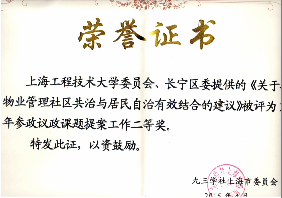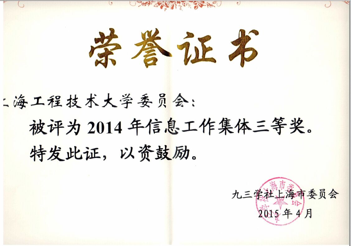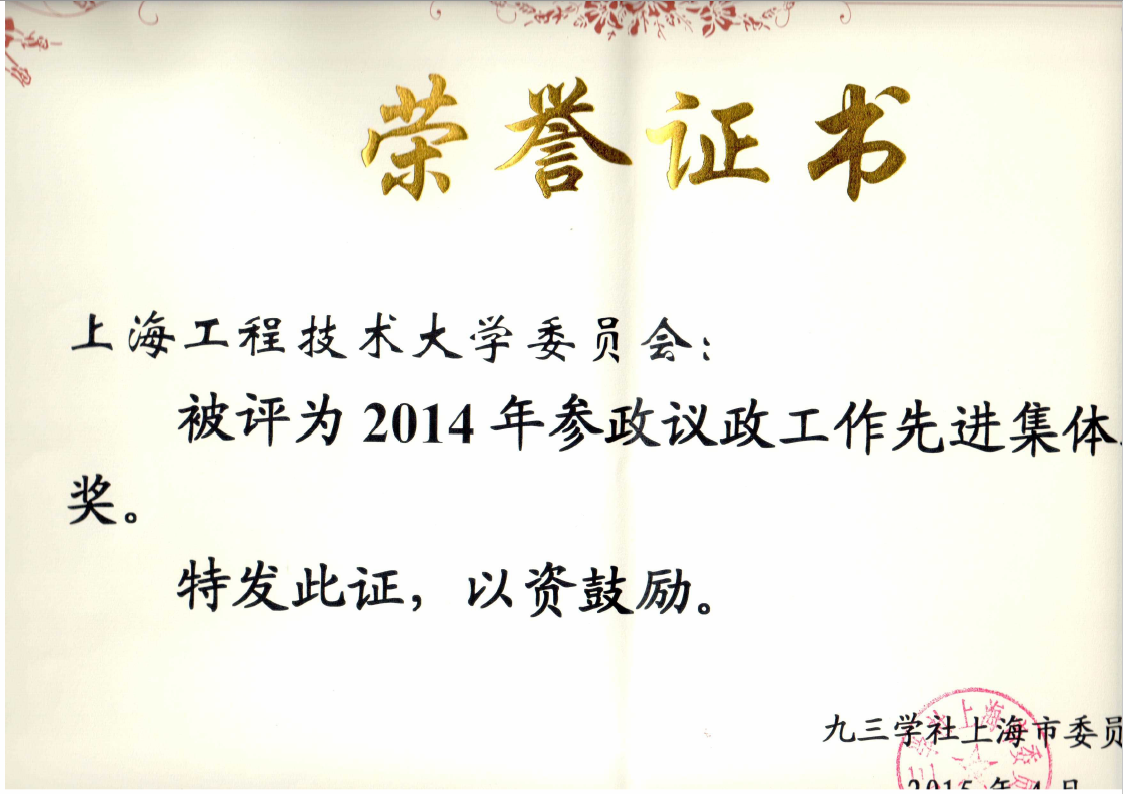 日前,九三学社上海市委隆重表彰了2014年度参政议政工作集体和个人。上海工程技术大学委员会荣获参政议政工作二等奖;郝勇教授领衔的二个课题获得课题提案二等奖(其中一个是与长宁区委合作完成);信息工作先进集体三等奖。在年初委员会申报的2015参政议政课题中,郝勇教授领衔的“医养融合中社区医护人力资源供需研究”获批市委重点课题;3项招标课题;和1项培育课题。