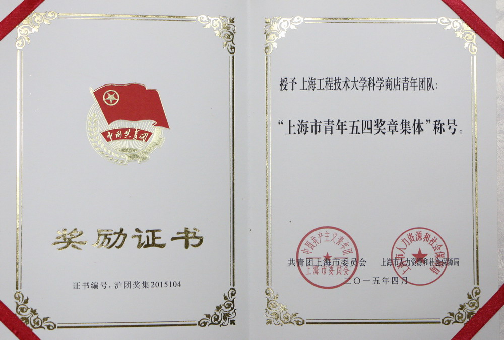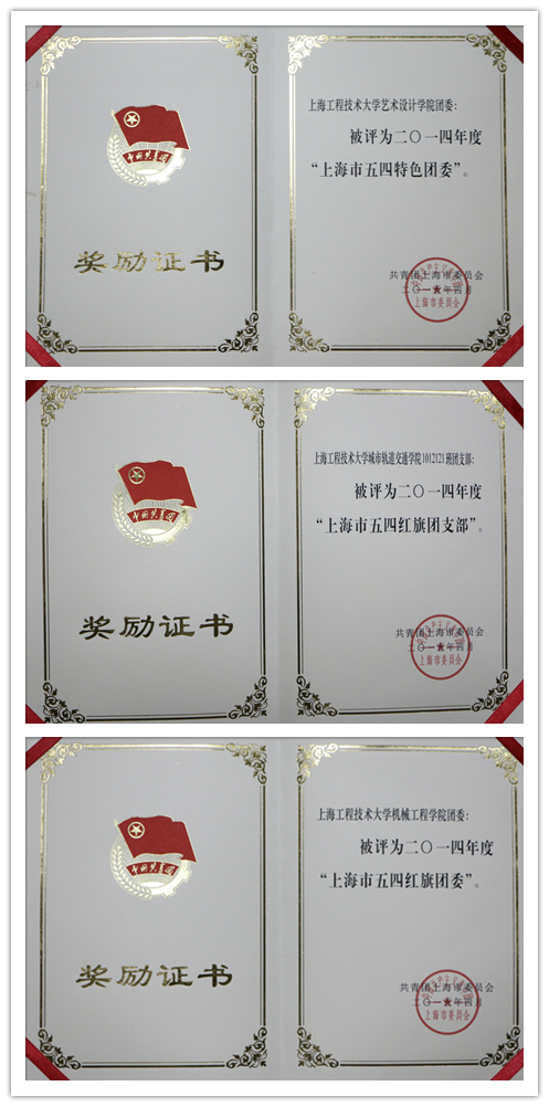 我校机械工程学院分团委获2014年上海市五四红旗团委称号、艺术设计学院分团委获2014年上海市五四特色团委称号、城市轨道交通学院1012121班团支部获2014年上海市五四红旗团支部称号。上海工程技术大学科学商店青年团队获2014年度“上海市青年五四奖章集体”称号、航空运输学院•飞行学院分团委书记林小希获2014年度“上海市青年五四奖章”称号;机械工程学院分团委书记王雁获2014年度“上海市优秀共青团员”称号。
