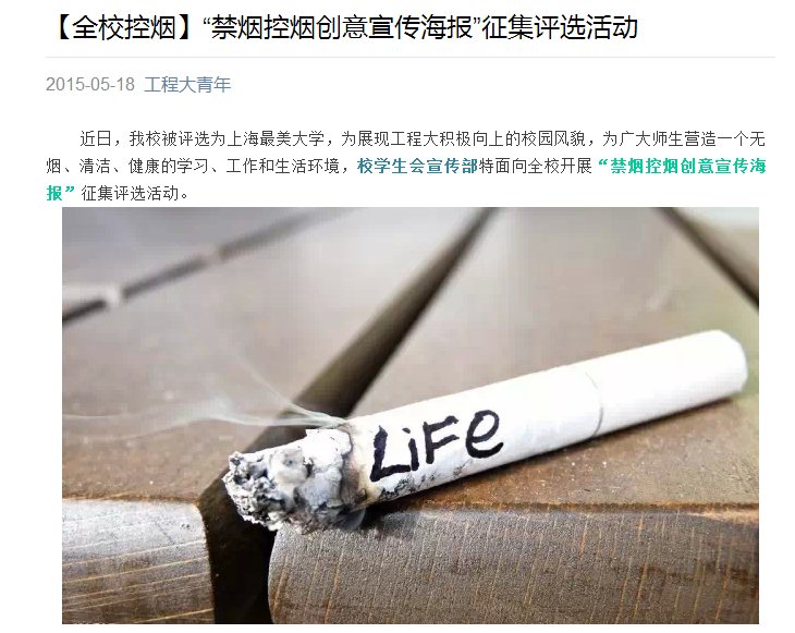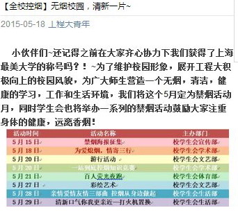 校团委就控烟主题开展了一系列线上、线下活动,线上活动以新媒体作为平台,通过同学们最喜欢的方式去推广和宣传吸烟的危害以及对于环境的影响,线下活动参与性较强,让更多师生参与其中,内容包括“一站到底控烟知识竞赛”、“健康生活拒绝烟草百人长跑活动”、“世界无烟日主题活动”、“控烟创意海报征集评选活动”等。