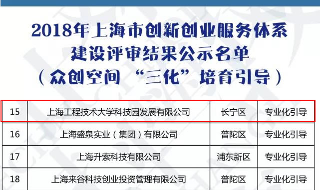 近日,依据《关于发布上海市2018年度“科技创新行动计划”创新创业服务体系建设项目指南的通知》(沪科〔2018〕30号)的要求,本市启动了创新创业服务体系建设工作。上海工程技术大学国家大学科技园喜获市级众创空间“专业化”培育引导项目立项。