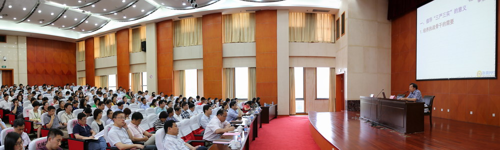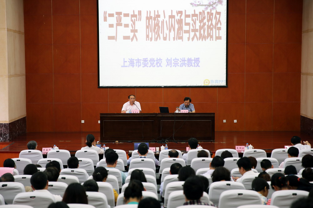 为了进一步增进对习近平总书记关于“三严三实”重要论述的理解与把握,6月16日下午,党委中心组举行扩大的学习会,邀请中共上海市委党校党史党建教研室主任、上海行政学院政党研究所所长刘宗洪教授来校做了一场“‘三严三实’的核心内涵与实践路径”学习辅导报告。校党委书记李江,党委副书记夏斯云、裴小倩,副校长史健勇、鲁嘉华,中心组成员、中层干部、辅导员共计200余人参加了会议。夏斯云副书记主持了学习会。