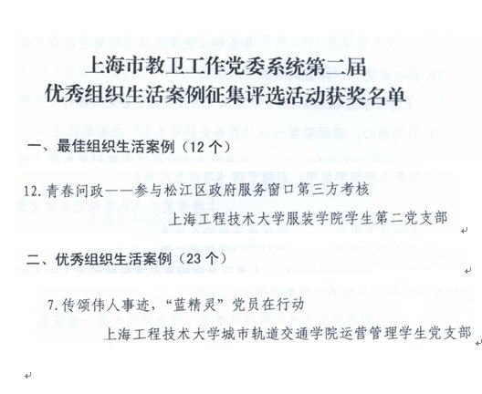 为着力提高党员组织生活质量,以组织生活的有效性促进党支部工作的有效性,年初,教卫工作党委启动了系统第二届优秀组织生活案例征集评选活动,在各单位报送的96个案例中,共评选出最佳组织生活案例12个,优秀组织生活案例23个。我校服装学院学生第二党支部《青春问政——参与松江区政府服务窗口第三方考核》获得最佳组织生活案例,城市轨道交通学院运营管理学生党支部《传颂伟人事迹,“蓝精灵”党员在行动》获得优秀组织生活案例。
