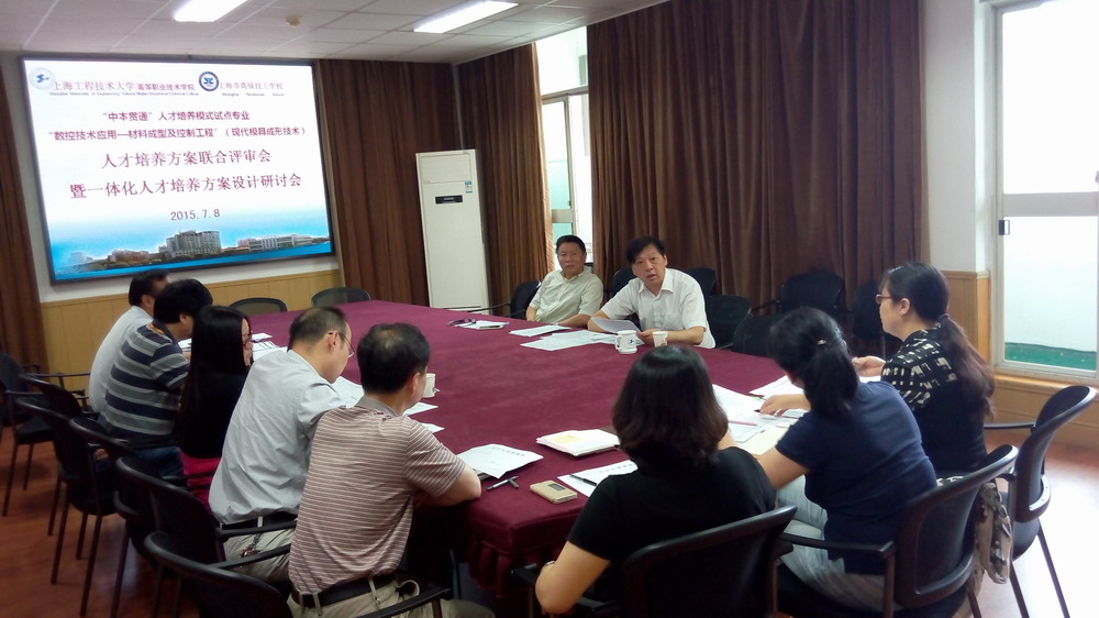 7月8日,联合教研组召开了“2015级人才培养方案联合评审会暨一体化人才培养方案设计研讨会”,就完善与落实2015级“数控技术应用—材料成型及控制工程”(现代模具成形技术)专业的人才培养方案进行了专题研讨,上海工程技术大学高职学院院长、上海市高级技工学校校长刘启中教授、副院(校)长胡宁教授、副院(校)长许锦彪,以及制造工程系、基础教学部、教务科相关人员参加研讨。