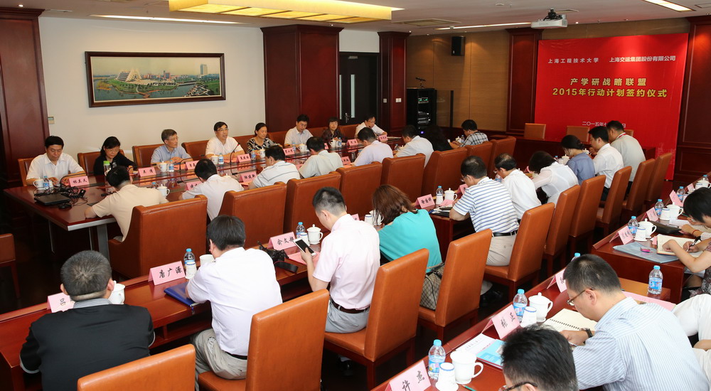签约仪式上,裴小倩副书记介绍了签约的背景,交运集团的周祯副书记详细解读了2015年行动计划的内容,鲁嘉华副校长代表工程大与上海交运集团股份有限公司的张弘副总裁共同签署产学研战略联盟2015年行动计划,汽车工程学院王岩松院长与上海交运集团汽车零部件制造分公司孙新毅总经理签署“1.3T平衡轴正向同步开发”等两项科技开发合同,与汽修公司党委书记及汽车零部件制造分公司孙新毅总经理签署两份卓越工程师学生实习协议。
