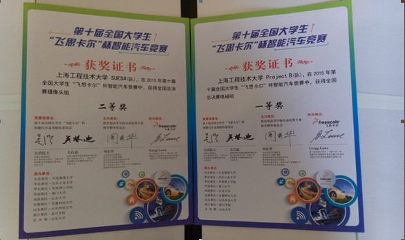 8月26日——8月29日,由教育部高校自动化类专业教学指导委员会主办,飞思卡尔公司协办的第十届全国大学生“飞思卡尔”杯智能汽车竞赛全国总决赛在山东大学中心校区体育馆隆重举行。经过激烈角逐,我校最后获得全国一等奖1项、二等奖1项;华东赛区一等奖3项、二等奖1项的优异成绩,竞赛成绩在上海市各参赛高校中名列前茅,