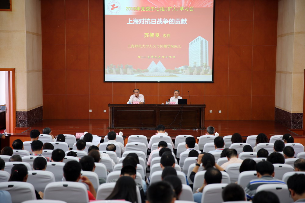 为了弘扬上海城市的抗战精神,切实增强忧患意识和责任意识,进而推进当前学校教育教学改革工作,值此纪念中国人民抗日战争暨世界反法西斯战争胜利70周年之际, 9月22日下午,党委中心组举行扩大的学习会,特邀上海师范大学人文与传播学院院长苏智良教授,来校作了一场“上海对抗日战争的贡献”主题报告。校党委书记李江,党委副书记夏斯云,副校长姚秀平、鲁嘉华,中心组成员、中层干部、辅导员近200余人参加了会议。夏斯云副书记主持了学习会。