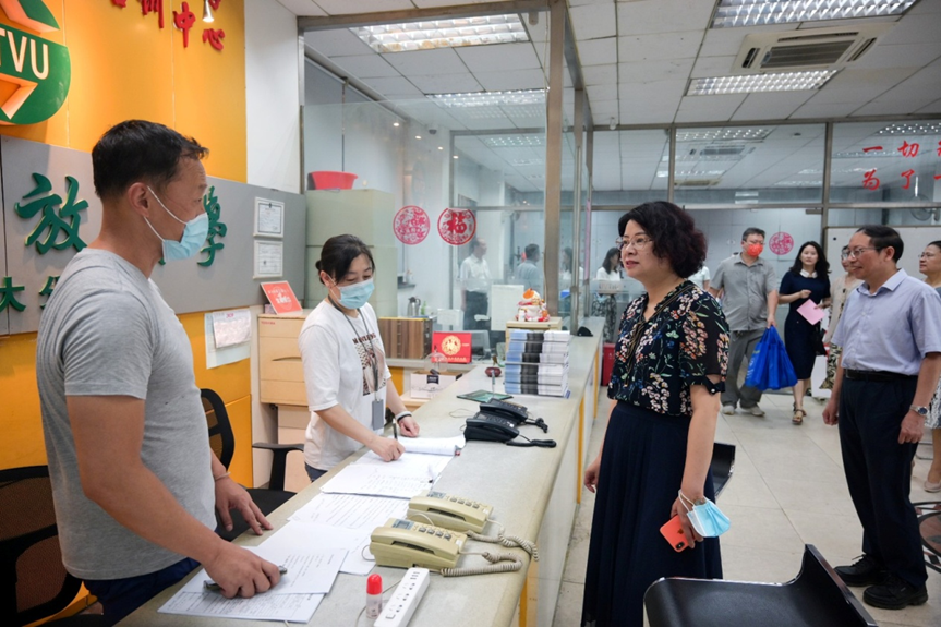 8月23日,朱晓青副书记、副校长一行来到虹口校区,先后走访了各科室、食堂、教学楼、上海开放大学工程大分校等地,她详细询问暑期工作情况,再三叮嘱大家认真工作的同时要注意防暑降温,绷紧安全这根弦,持续守牢疫情防控阵地。