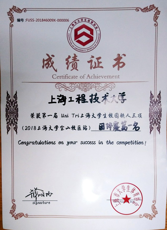 长跑队队员在体育部蔡二康老师的精心指导和科学训练下,队员们的心肺功能、肌肉耐力和爆发力得到极大提高,比赛热情愈发高涨,为本次比赛取得优异成绩打下了良好的基础。全程7.2公里对队员们的身体素质是巨大考验,游泳之后的心率爆表,自行车之后的大腿酸软,跑步过程中的呼吸节奏调节,每次换项环节都是一次难熬的身体调节。但在比赛中,我校队员们拼尽全力,充分展现出了上海工程技术大学学生应有的良好风貌。最终队员们披荆斩棘,奋勇拼搏,突破个人极限在百名运动精英中脱颖而出。孙恒,祝文,桑秀吕分别荣获男子个人第二、四、五名。累计团队总成绩位居榜首,荣获男子团体冠军。