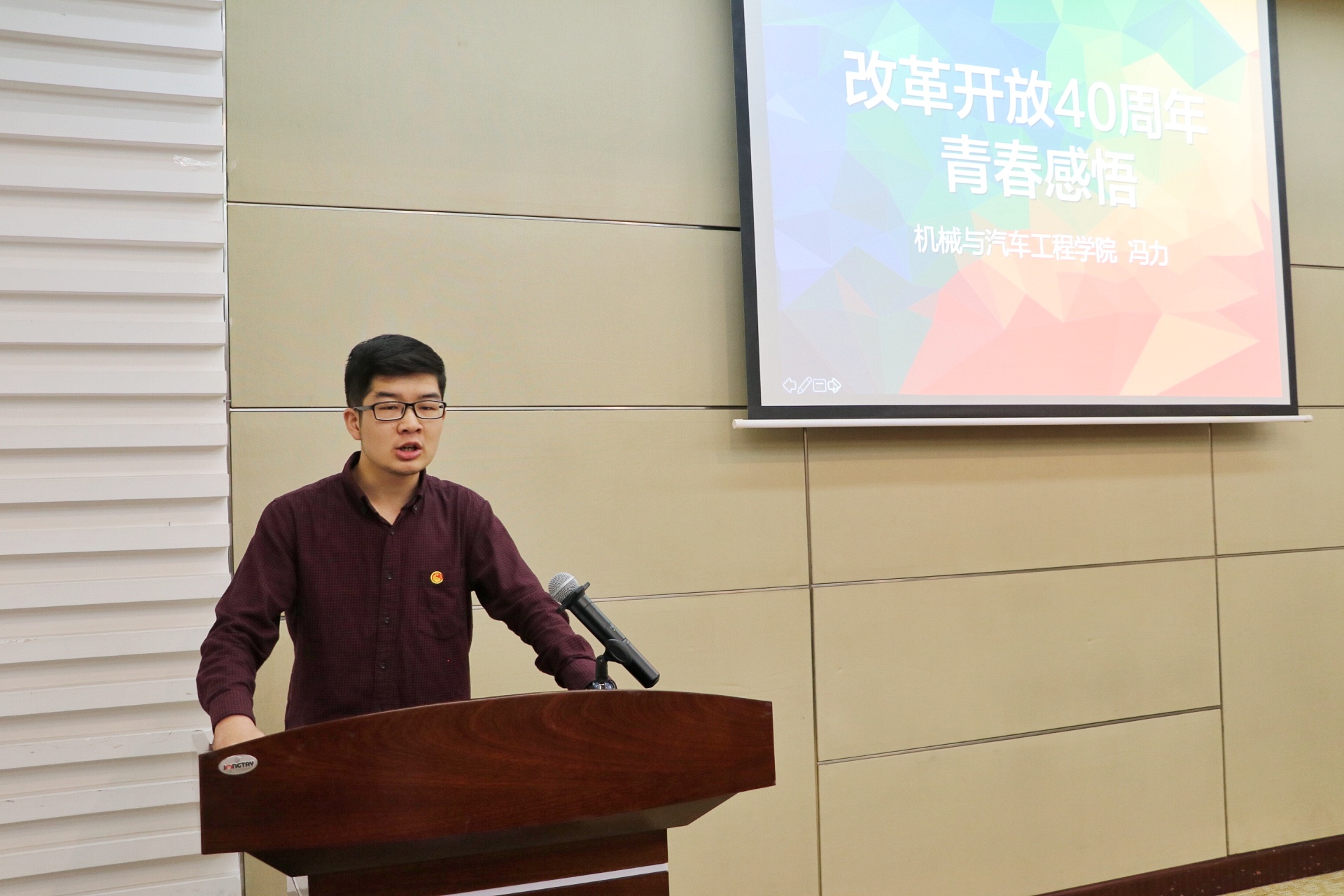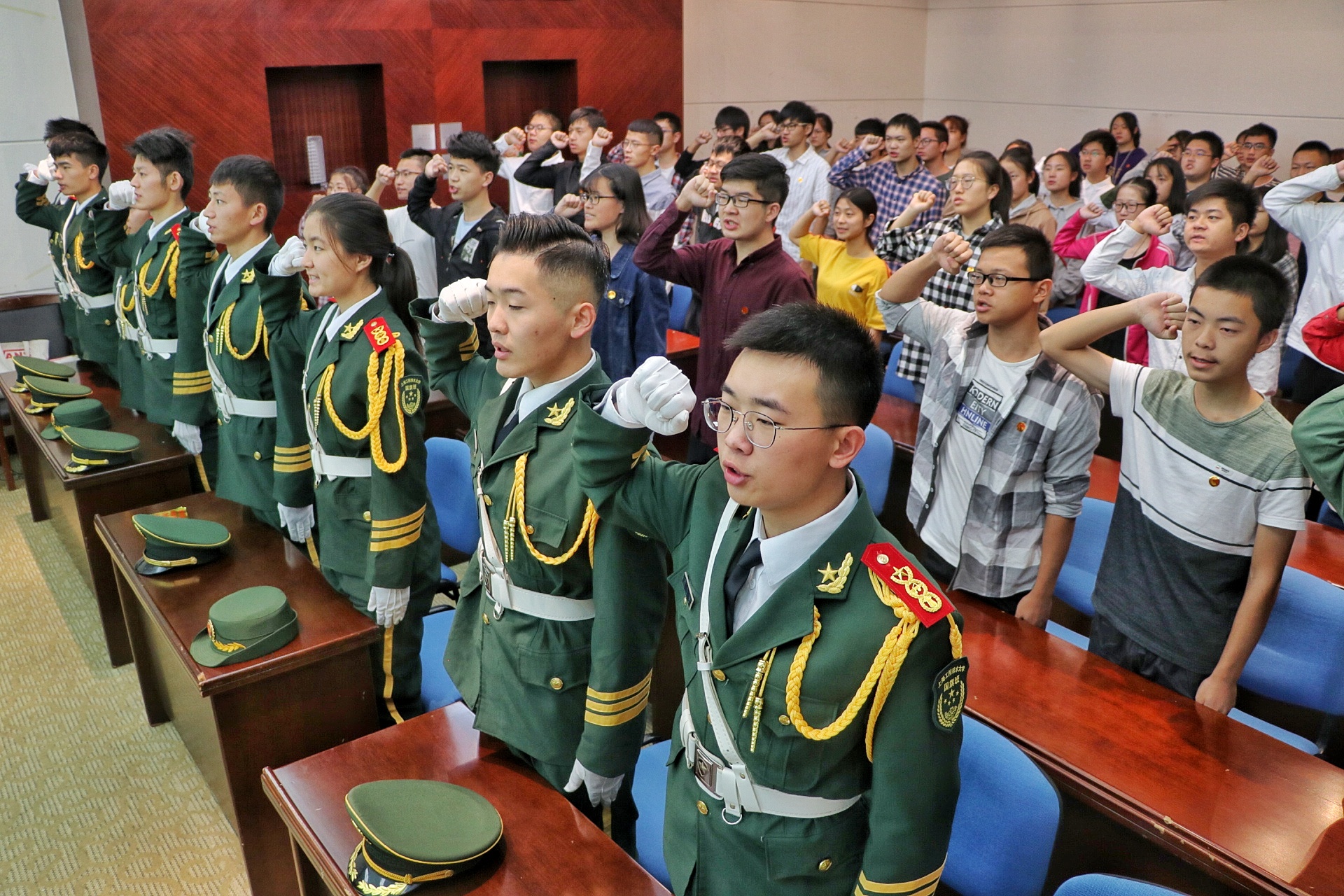 升旗仪式后,团员青年参加了在图文信息中心第四报告厅举行的“在国旗下成长”主题青春分享会。国旗护卫队队长尚泽坤同学向同学们分享了自己和学校国旗护卫队共同成长经历;机械与汽车工程学院冯力同学分享了改革开放四十年来国家经济、教育、综合国力突飞猛进的发展,同学们无不为祖国的繁荣强盛发出赞叹。在团学干部的带领下,全场青年团员、校庆志愿者代表共同庄严宣誓:争做优秀工程大青年,热爱祖国、敢为人先、求真务实、开拓创新,在新时代放飞青春梦想,书写人生华章!