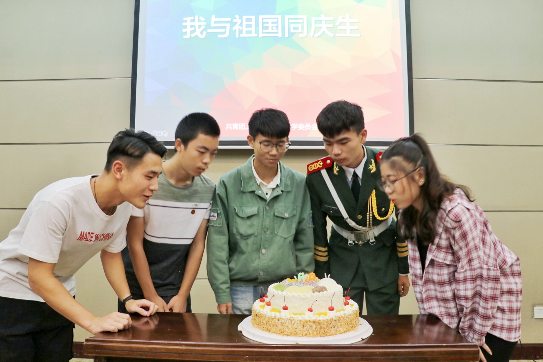 分享会后,团委为国庆当天生日的团员青年代表举行了集体生日,并邀请他们讲述了与祖国一同生日的青春感言。在全场“生日快乐”的祝福声中,同学们共同切开蛋糕,为自己送上祝福,更为共和国华诞喝彩。来自电子电气工程学院的大一新生代表徐和云表示:通过参与升旗仪式的方式将个人与共和国的生日相联系是最进入大学以来有意义的事,自己也励志要发奋学习,用实际行动为实现中华民族伟大复兴的中国梦添砖加瓦。