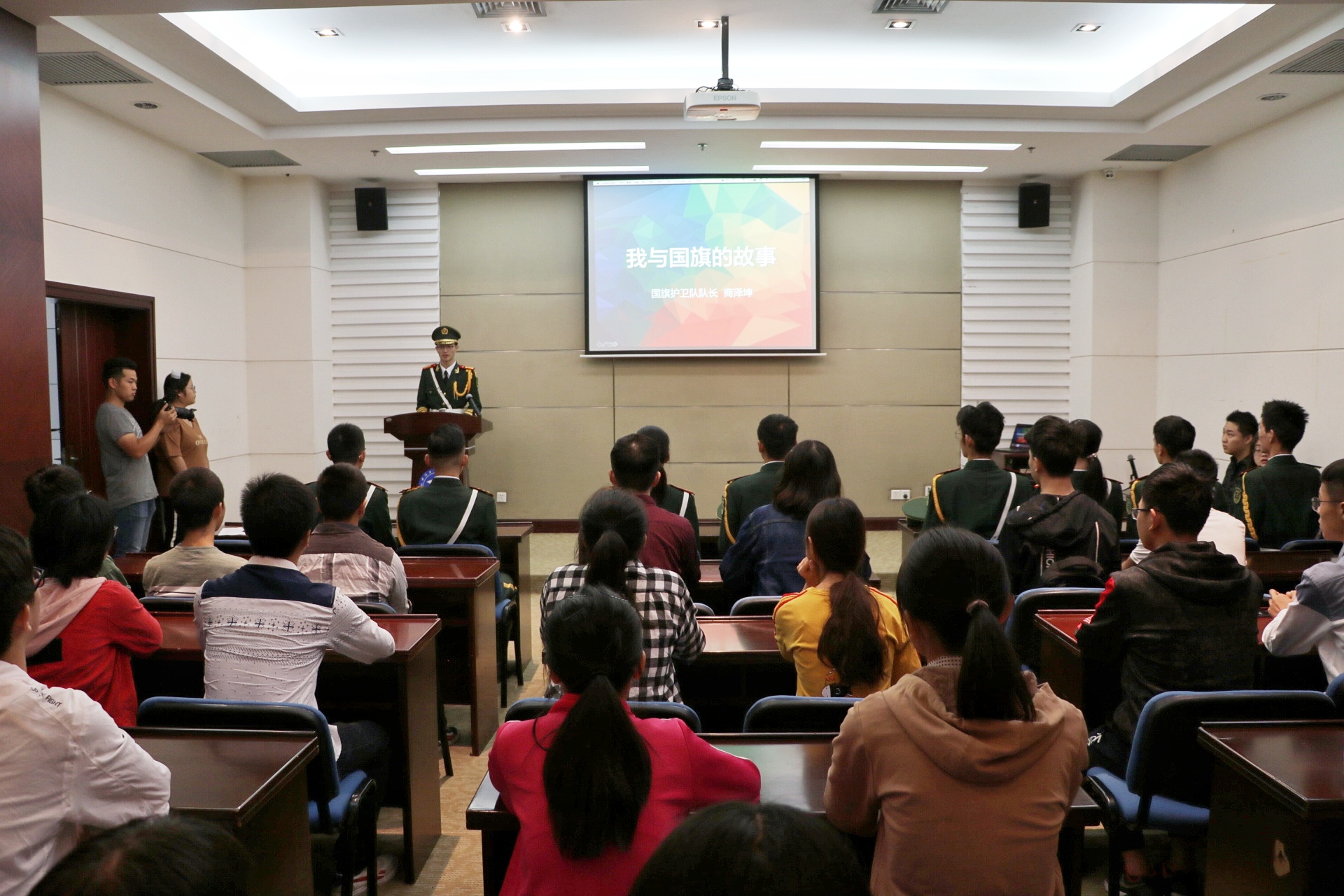 上午7时15分,英姿飒爽、意气风发的工程大国旗护卫队成员迈着整齐、有力的步伐护送国旗入场。伴着庄严嘹亮的国歌声,五星红旗冉冉升起。现场师生向国旗行注目礼,高唱国歌,表达对伟大祖国诞辰六十九周年的诚挚祝福。