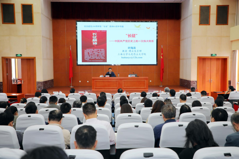 为深入推进党史学习教育,在纪念红军长征胜利85周年之际,10月18日下午,校党委中心组在行政楼B301举行专题(扩大)学习会,特邀上海大学马克思主义学院特聘教授、博士生导师叶海涛教授作《“长征”:中国共产党历史上的伟大转折》专题辅导报告。校党委中心组成员、全体中层干部、辅导员参会,会议由校党委副书记、副校长朱晓青主持。